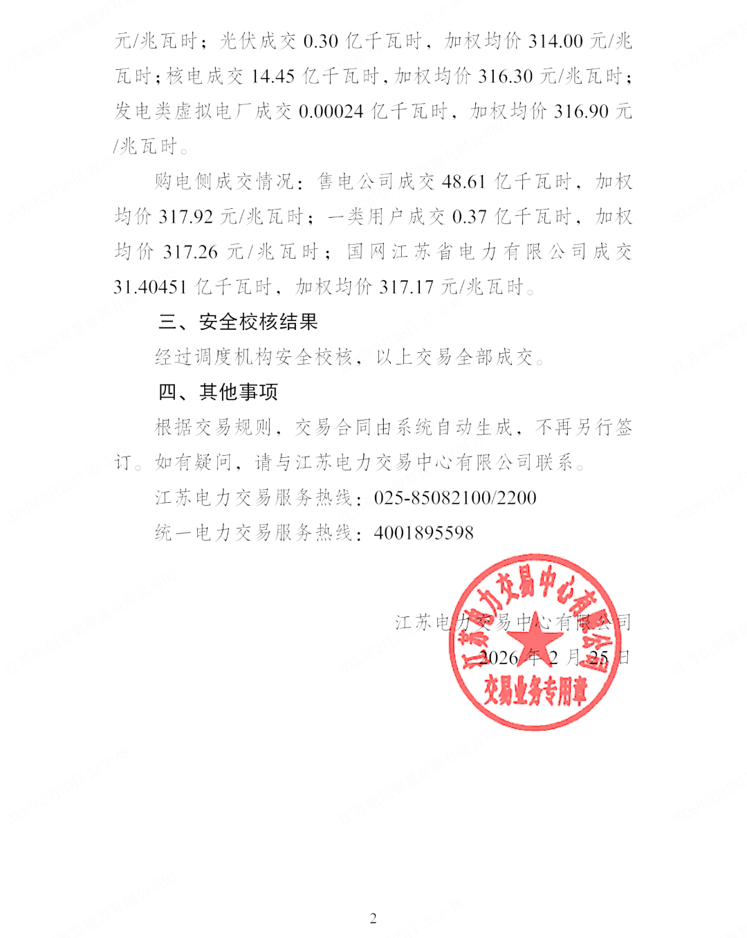 2月25日,江苏电力交易中心有限公司发布《2026年3月份江苏电力集中竞价交易结果公示》。