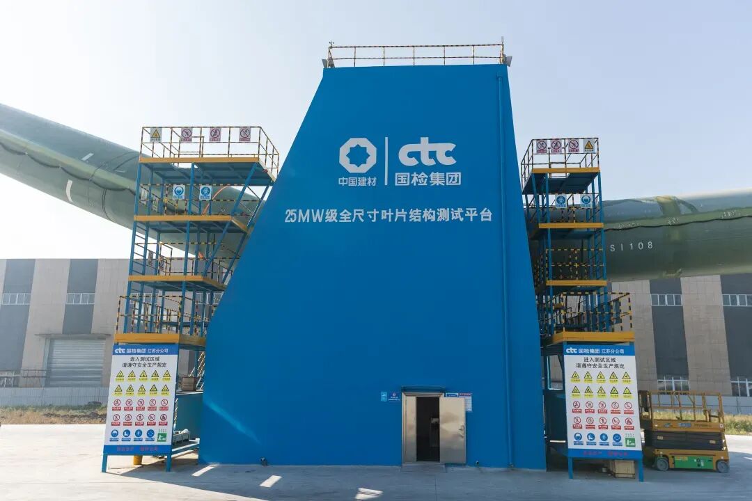 2024年10月,国检集团25MW级全尺寸风电叶片结构试验平台正式投运,项目为单座三向测试平台,可测试叶片最大功率级别25MW+、最长可测试叶片长度180米、最大叶根节圆直径7.8米。静力测试系统可实现20点同步加载,疲劳测试系统具备闭环控制的多模式激振,满足大载荷、高精度的测试要求。