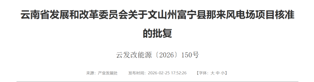 2月25日,云南省发展和改革委员会发布关于文山州富宁县新华风电场项目、文山州富宁县那来风电场项目核准的批复。