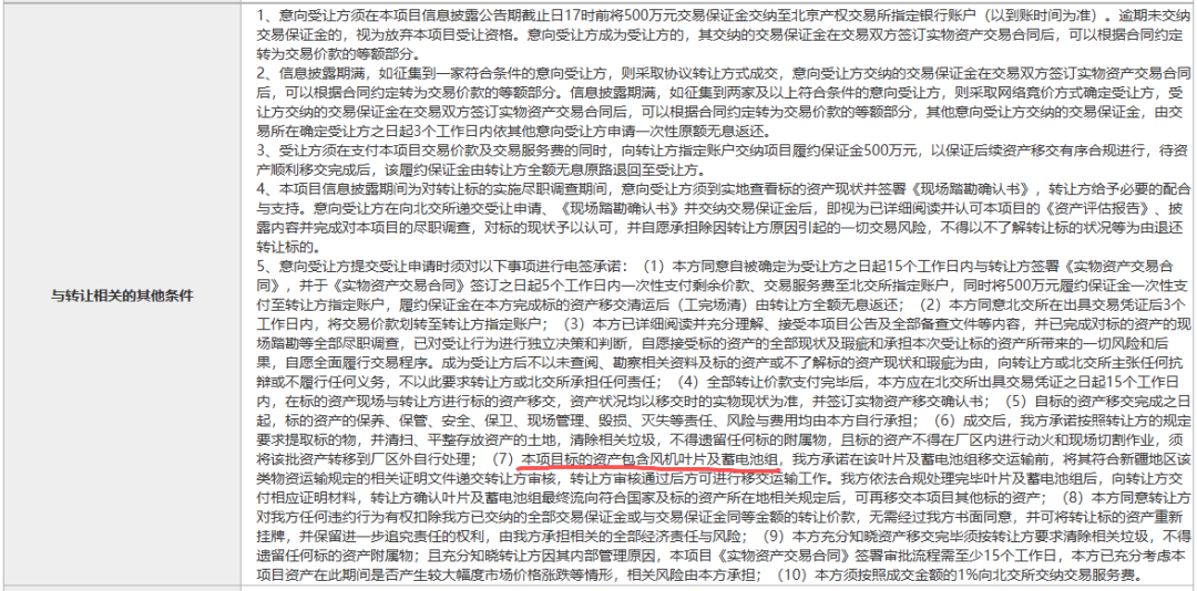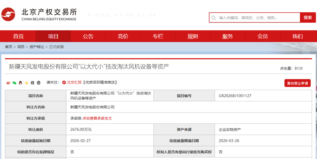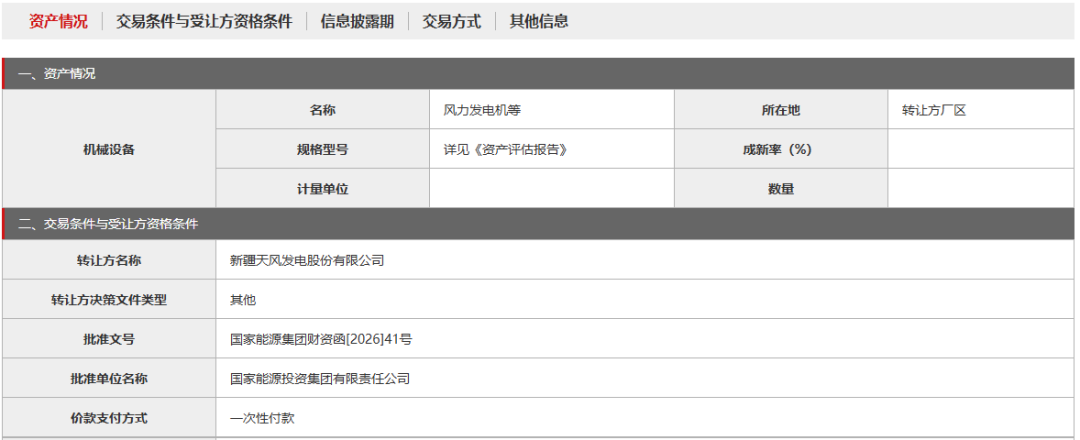 北极星风力发电网讯:2月27日从“北京产权交易所”获悉,新疆天风发电股份有限公司“以大代小”技改淘汰风机设备等资产转让,转让底价2676.00万元,项目标的资产包含风机叶片及蓄电池组。