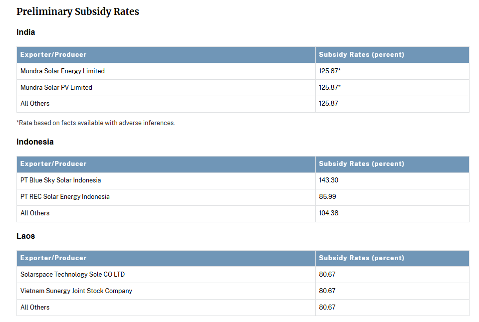 印度:Mundra Solar Energy Limited 和 Mundra Solar PV Limited(均为阿达尼集团旗下公司)以及所有其他印度公司的补贴率均被定为125.87%。