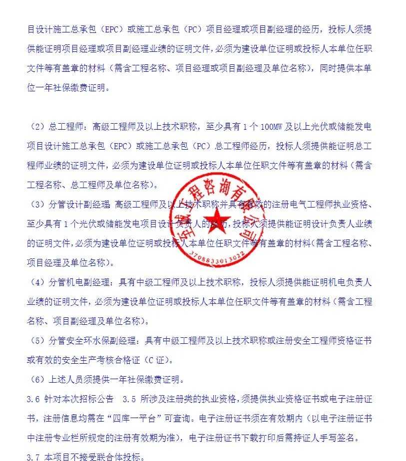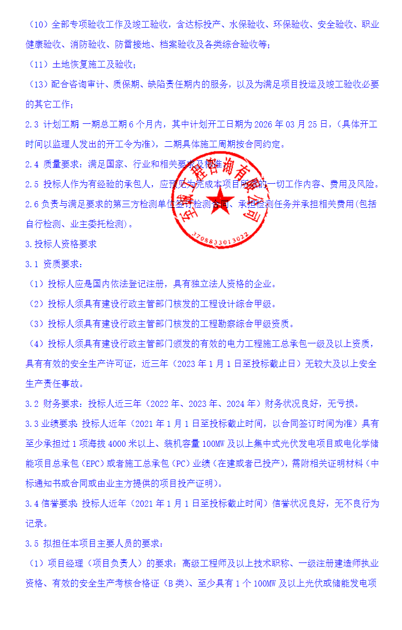 项目要求投标人五年内至少承担过1项海拔4000米以上、装机容量100MW及以上集中式光伏发电项目或电化学储能项目总承包(EPC)或者施工总承包(PC)业绩(在建或者已投产)。