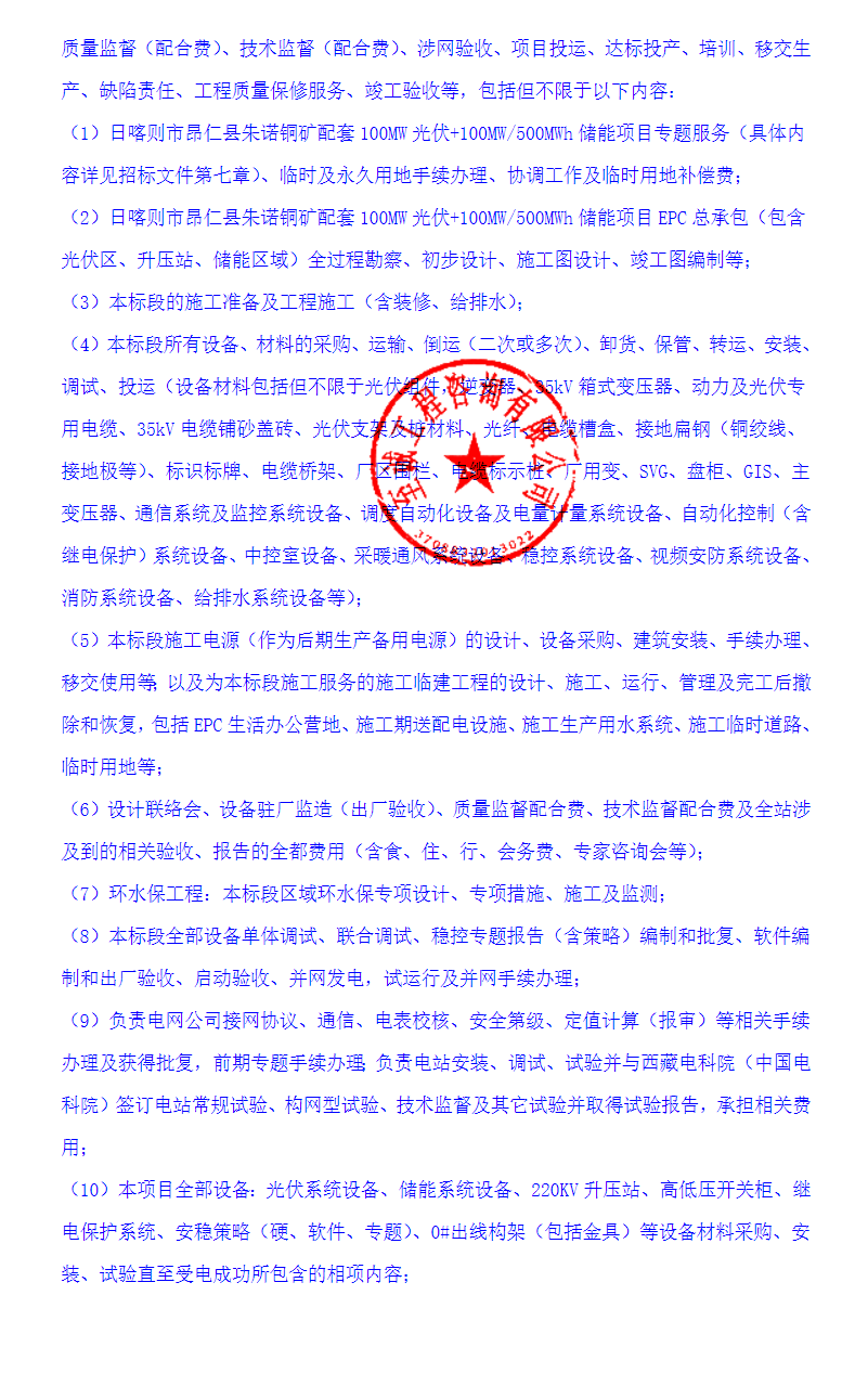 招标范围包括本标段按期投运及竣工验收而开展的全过程勘察设计、设备材料采购、建筑安装、设备调试、质量监督、技术监督、涉网验收、项目投运、达标投产、培训、移交生产、缺陷责仁、工程质量保修服务、竣工验收等。