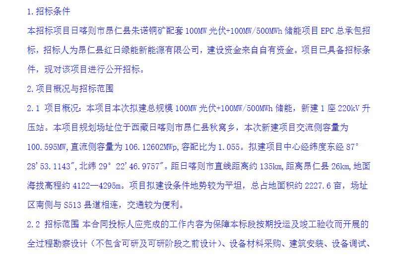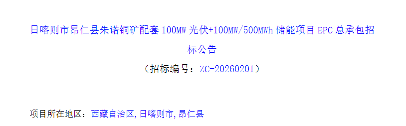 北极星储能网讯:2026年2月13日,西藏日喀则市昂仁县朱诺铜矿配套100MW光伏+100MW/500MWh储能项目发布EPC总承包招标公告,项目资金来源为自筹资金56000万元,招标人为西藏耀晖新能源全资控股的昂仁县红日绿能新能源有限公司。