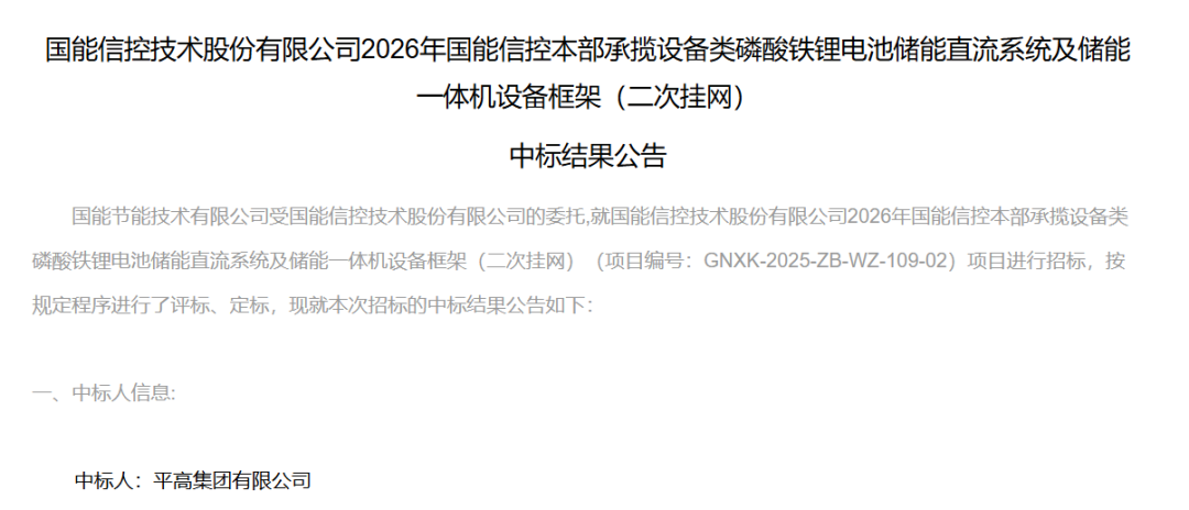 北极星储能网讯:2026年2月26日,国能信控技术股份有限公司发布2026年国能信控本部承揽设备类磷酸铁锂电池储能直流系统及储能体机设备框架(二次挂网)中标结果公告,中标企业为平高集团有限公司。