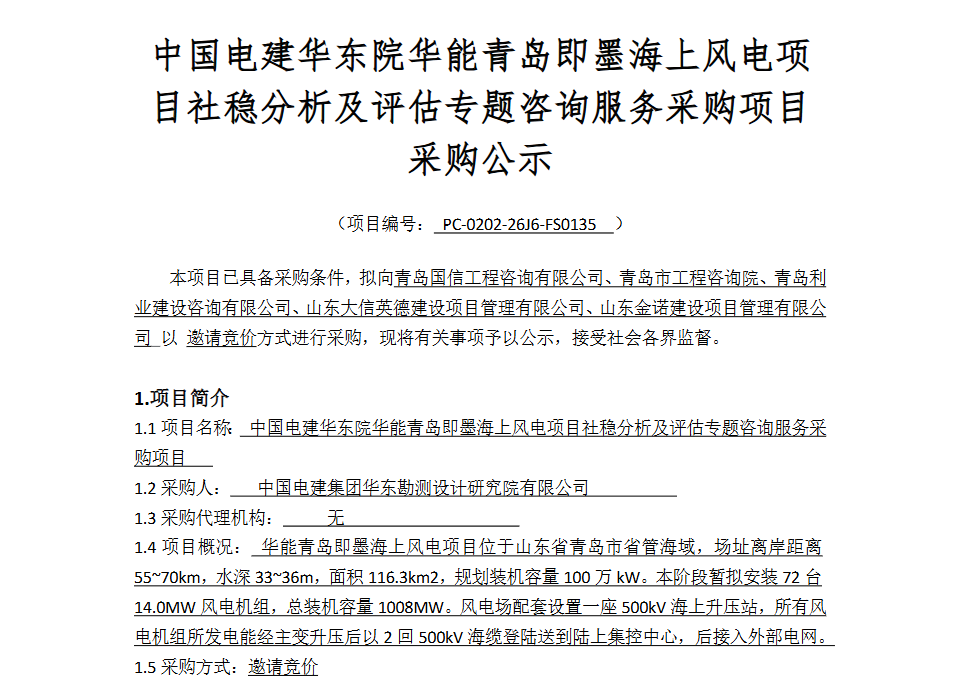 2月27日,中国电建阳光采购网发布《中国电建华东院华能青岛即墨海上风电项目社稳分析及评估专题咨询服务采购项目采购公示》。