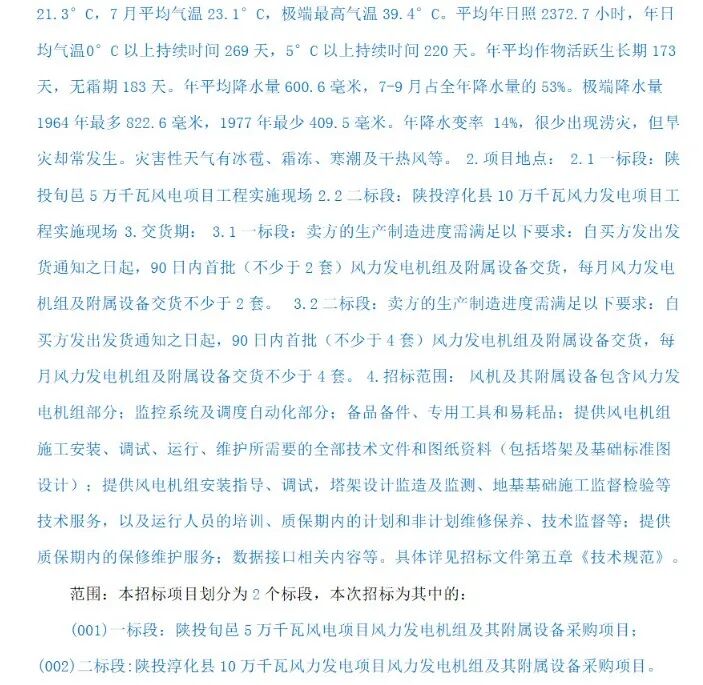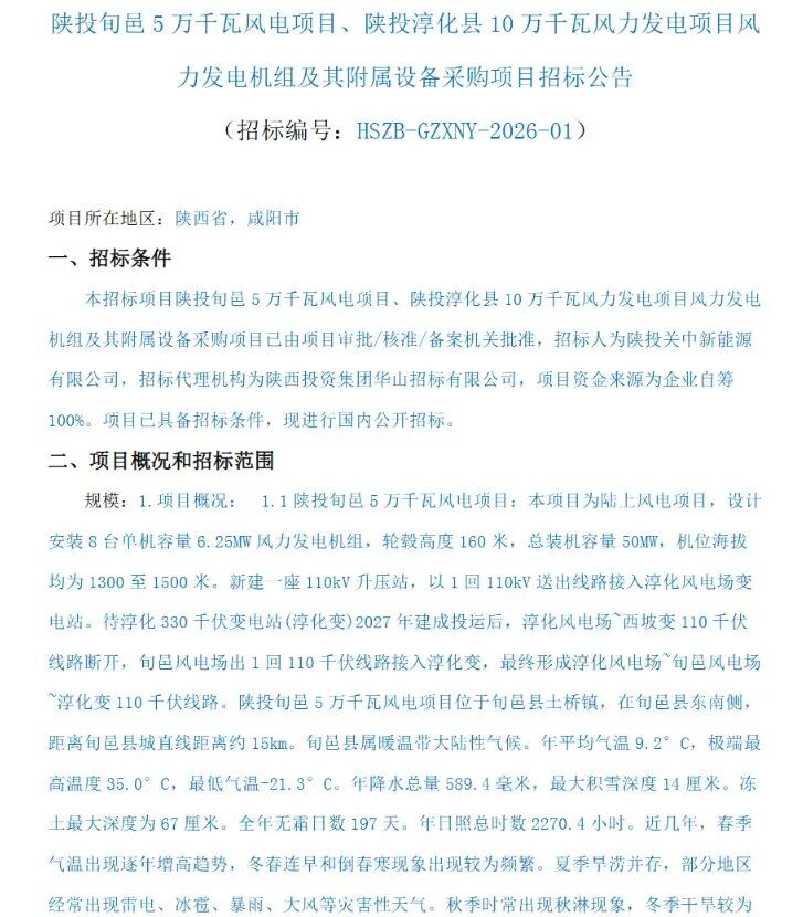北极星风力发电网获悉,2月27日,陕投旬邑5万千瓦风电项目、陕投淳化县10万千瓦风力发电项目风力发电机组及其附属设备采购项目招标。