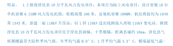 标段二:陕投淳化县10万千瓦风力发电项目设计安装16台单机容量6.25MW风力发电机组,轮毂高度160米,总装机容量100MW,机位海拔均为1049至1343米。新建一座110kV升压站,以1回110kV送出线路接入西坡110kV变电站。陕投淳化县10万千瓦风力发电项目位于淳化县润镇、十里塬镇,距离县城约16km。