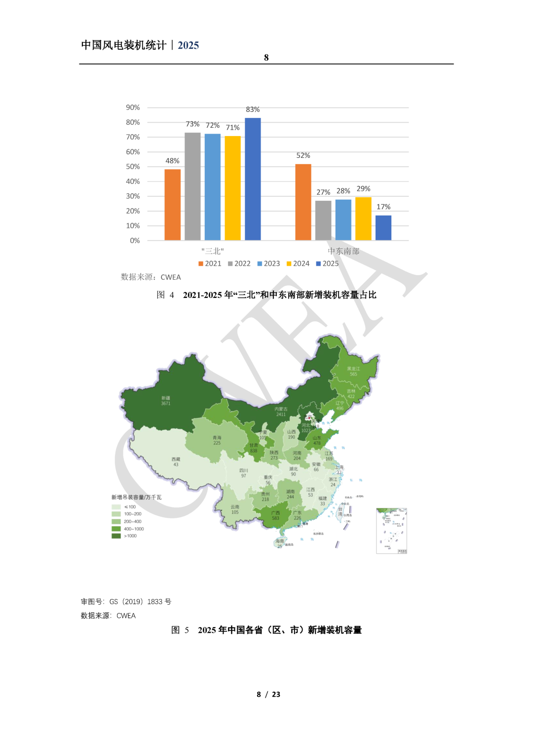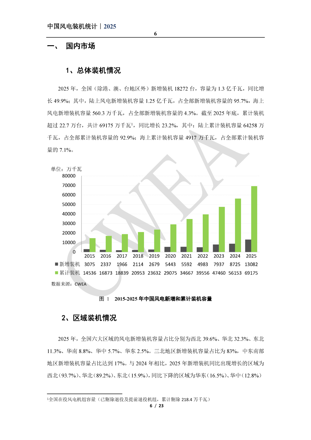 本统计中的“风电装机容量”是指“吊装容量”,指统计期内风电机组制造企业发货到风电场现场,施工单位完成风电机组所有部件吊装完毕、且完成安装验收或静态调试后的装机容量。