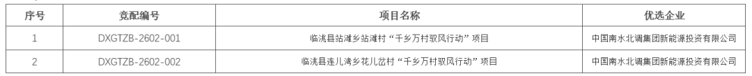 根据公示,本批次竞配共涉及两个风电项目,总容量40MW。临洮县站滩乡站滩村“千乡万村驭风行动”项目、临洮县连儿湾乡花儿岔村“千乡万村驭风行动”项目,优选企业均为中国南水北调集团新能源投资有限公司。