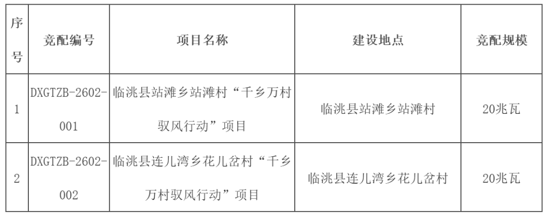 2月2日,临洮县2025年“千乡万村驭风行动”项目竞争性配置启动。公告显示,竞争性配置总规模40兆瓦,分别位于临洮县站滩乡站滩村、临洮县连儿湾乡花儿岔村。