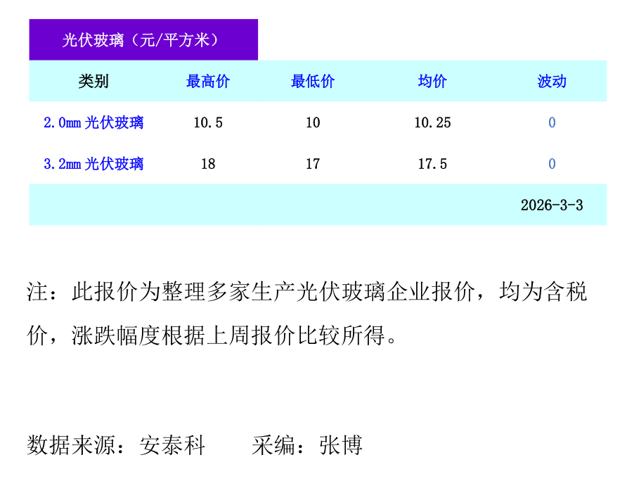3月3日,硅业分会公布光伏玻璃价格,整体价格平稳。
