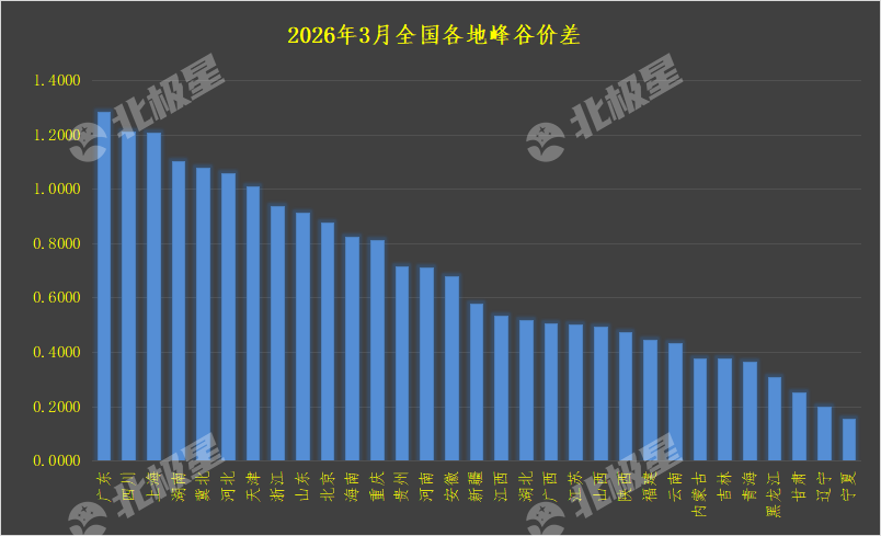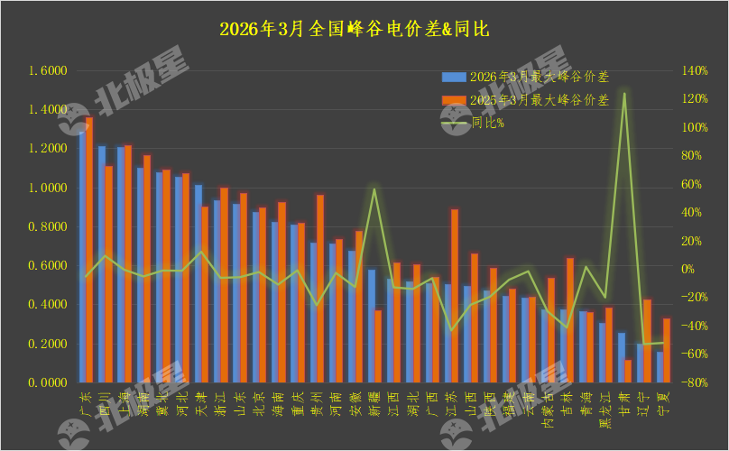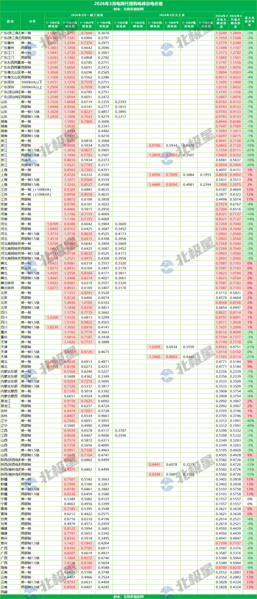 北极星储能网讯:2月28日,全国31个省市2026年3月代理购电工商业用户电价表已经全部公布(包括河南、云南)。整体来看,3月延续了2月最大峰谷价差普遍下降的趋势、且同比降幅较上月进一步增大,超过70%的地区环比呈现1%-40%不同程度降幅。