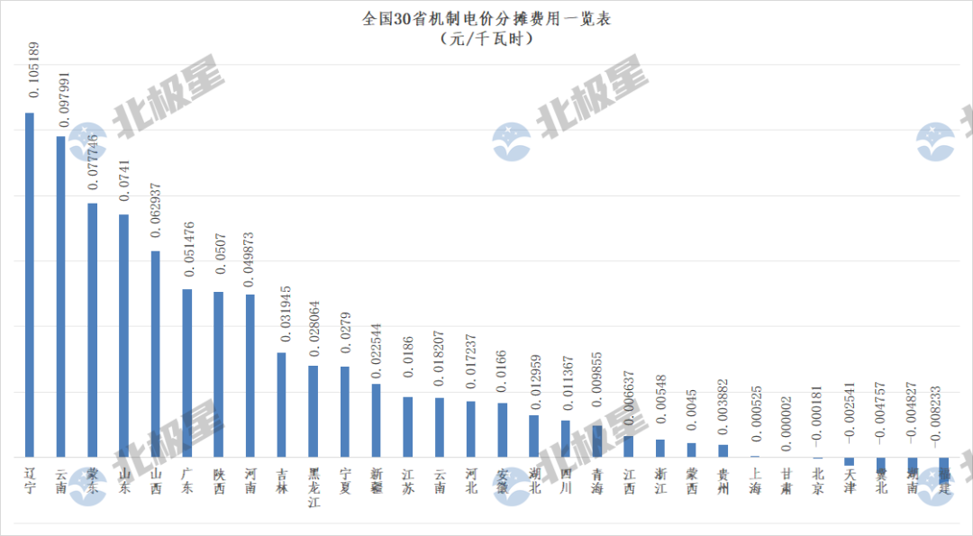 此外,北极星储能网注意到,系统运行费用折合度电水平所包含的分支中,全国有30个省市明确了新能源可持续发展价格结算机制差价结算费用度电水平,即新能源机制电价分摊水平,区间在-0.008233~0.105189元/kWh,其中以辽宁最高,福建最低。而北京、天津、冀北、湖南、福建的机制电费差价均为负值。
