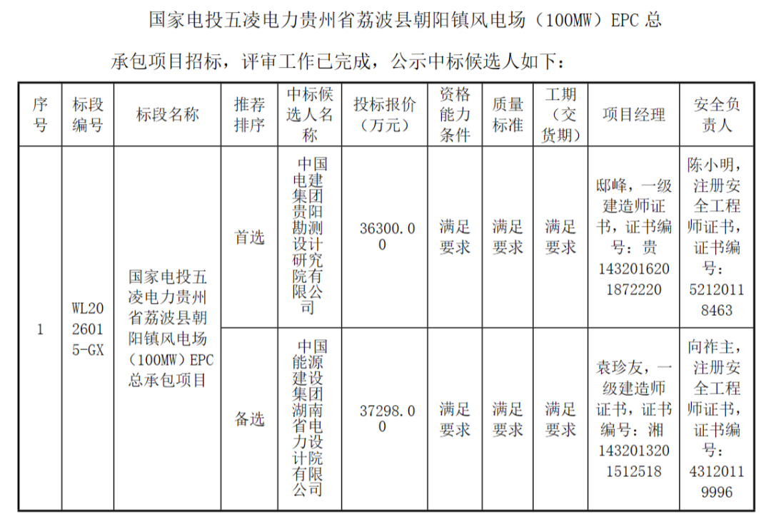 3月2日,国家电投五凌电力贵州省荔波县朝阳镇风电场(100MW)、国家电投五凌电力荔波县佳荣镇拉易100MW风电工程EPC总承包项目招标采购中标候选人。