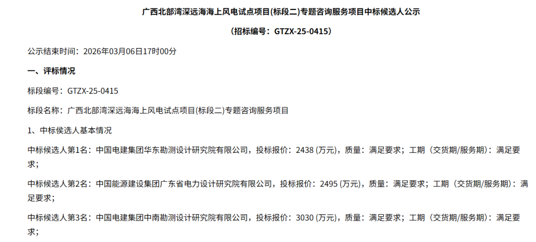 3月3日,广西投资集团电子采购平台发布广西北部湾深远海海上风电试点项目标段一、标段二专题咨询服务项目中标候选人公示的公告。
