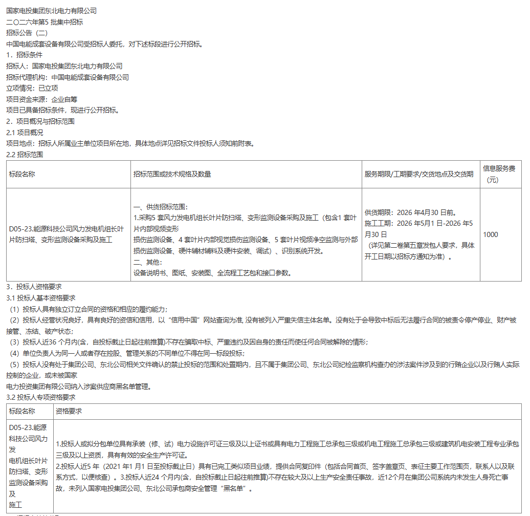 本次招标聚焦核心安全需求,采购5套全套监测设备及配套系统开发,涵盖叶片内部视频变形损伤监测、外部损伤监测等关键模块,要求2026年4月30日前完成供货,5月1日至30日全面施工。