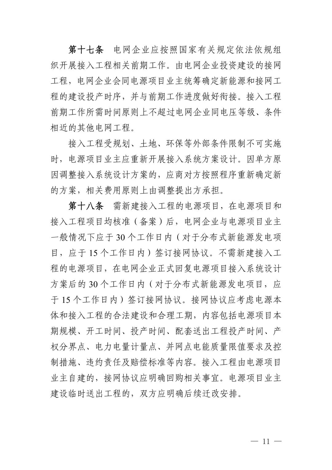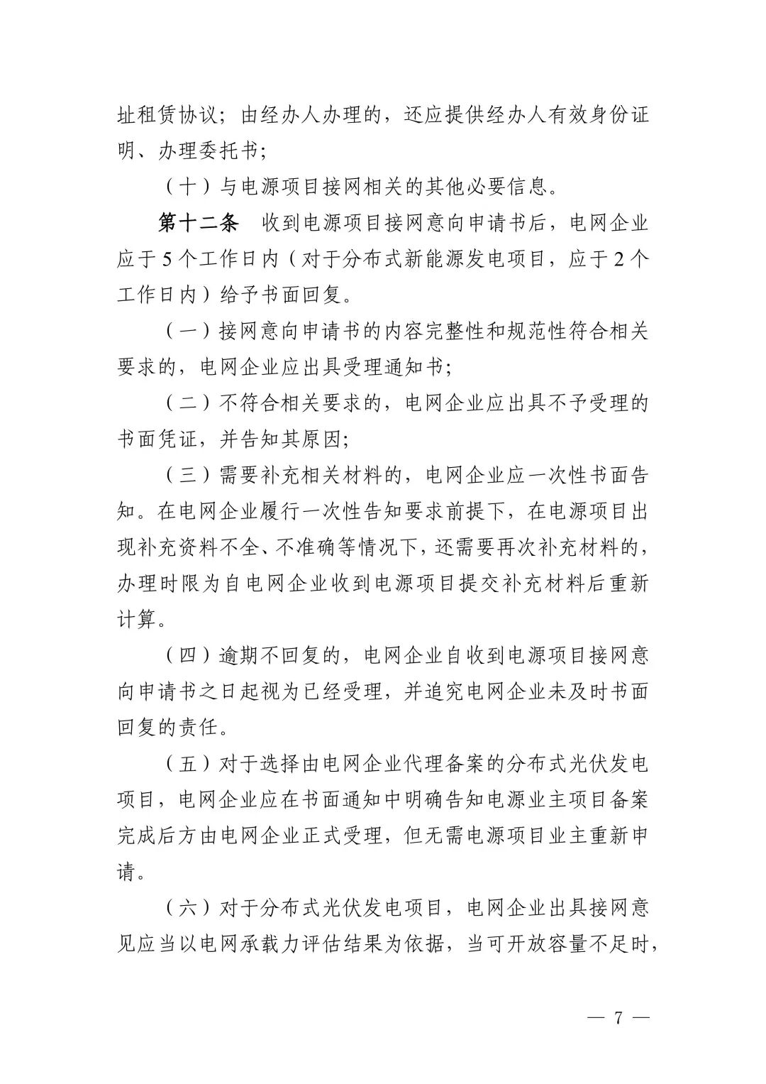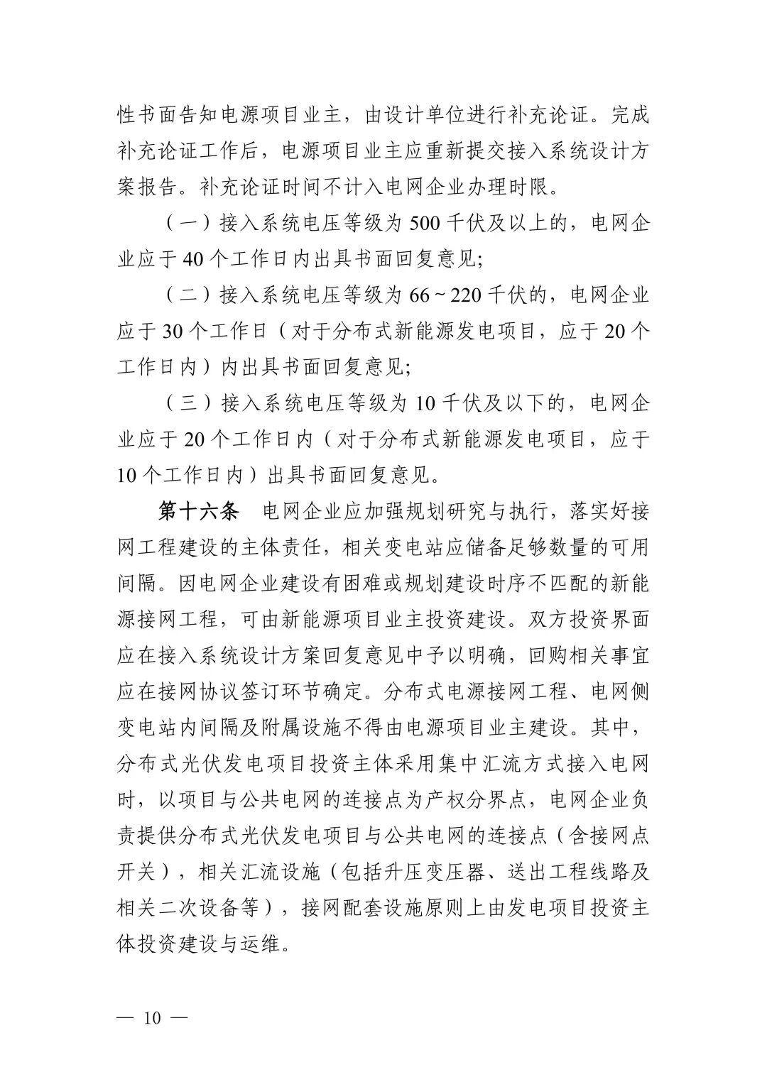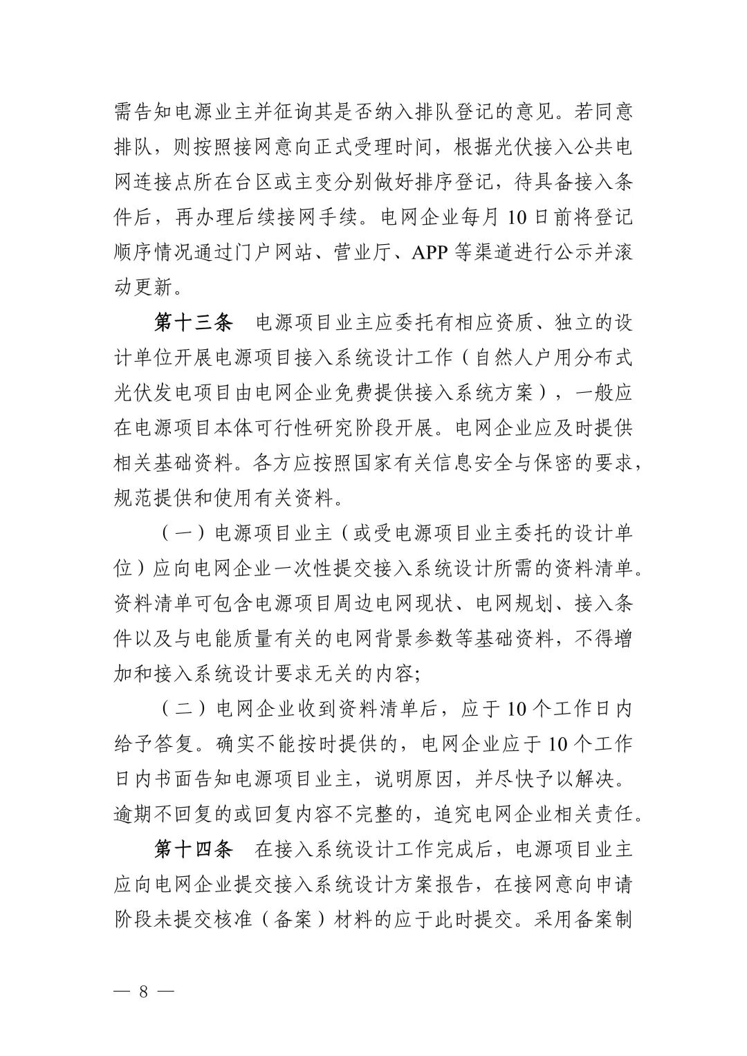 2.规范电源接入电网全流程管理。一是加强各方协同,要求地方能源主管部门及时向电网企业抄送已立项的各类电源项目信息,电网企业在获取项目信息后主动对接项目业主,告知接网前各环节流程时限并督促其提交接网意向。二是优化接入服务,规定电网企业为自然人户用分布式光伏项目免费提供接入系统方案,分布式光伏按电网承载力受理,容量不足时实行排队登记并每月公示。三是明确电网企业为接网工程建设主体,分布式电源接网工程等不得由业主建设。