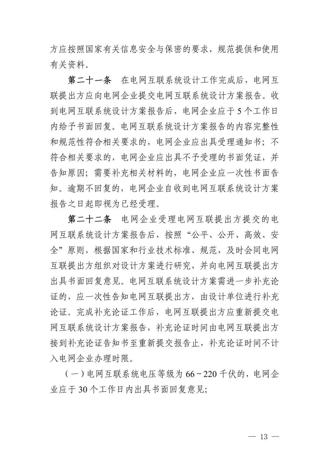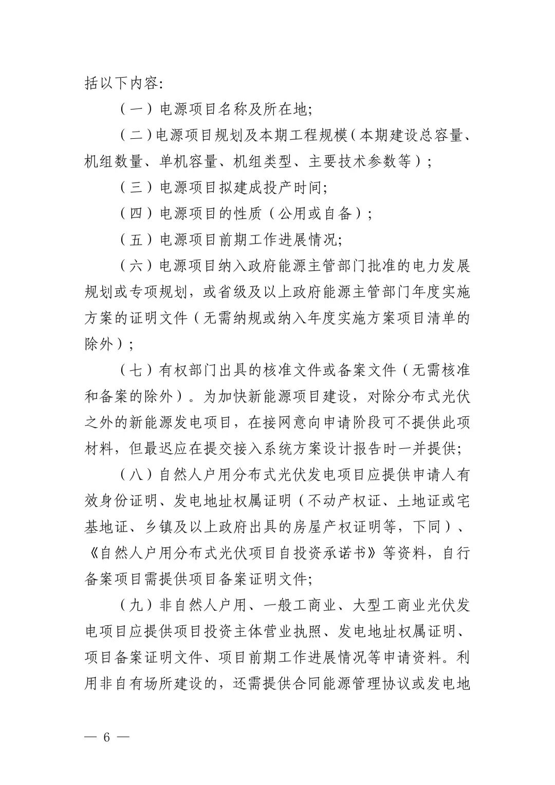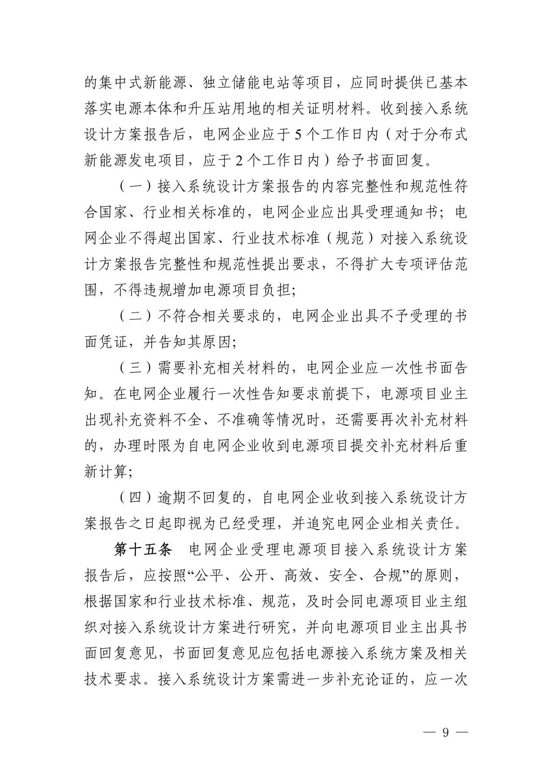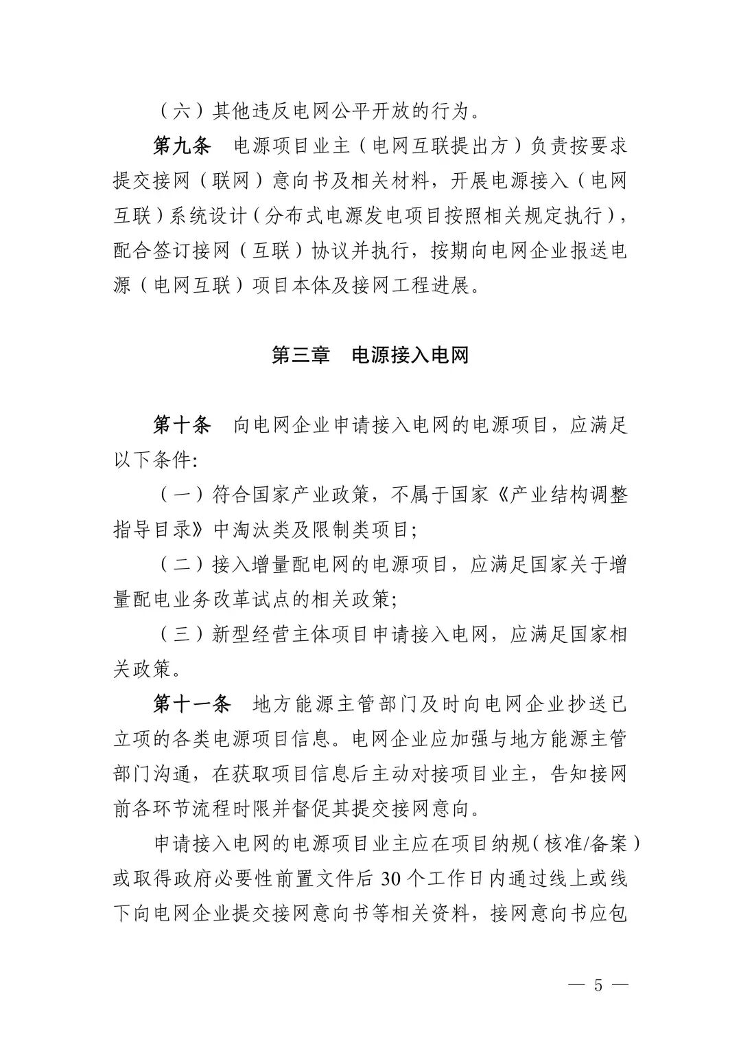 2.规范电源接入电网全流程管理。一是加强各方协同,要求地方能源主管部门及时向电网企业抄送已立项的各类电源项目信息,电网企业在获取项目信息后主动对接项目业主,告知接网前各环节流程时限并督促其提交接网意向。二是优化接入服务,规定电网企业为自然人户用分布式光伏项目免费提供接入系统方案,分布式光伏按电网承载力受理,容量不足时实行排队登记并每月公示。三是明确电网企业为接网工程建设主体,分布式电源接网工程等不得由业主建设。