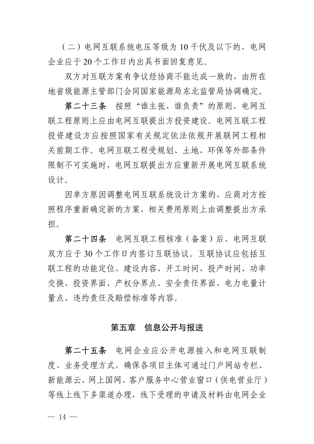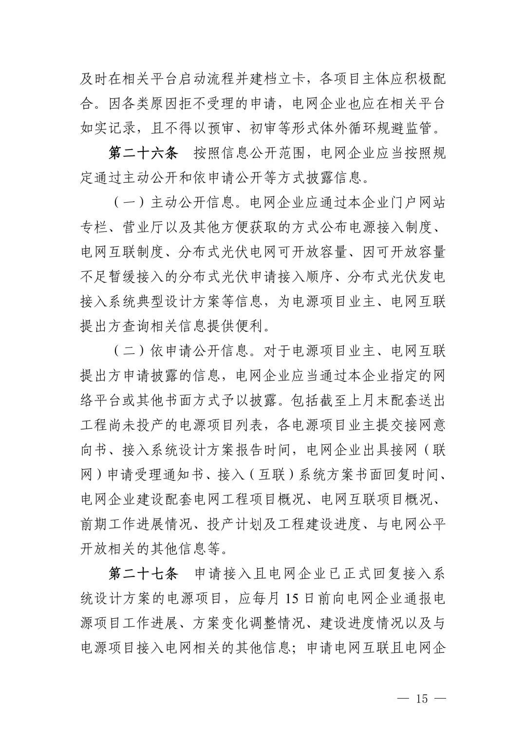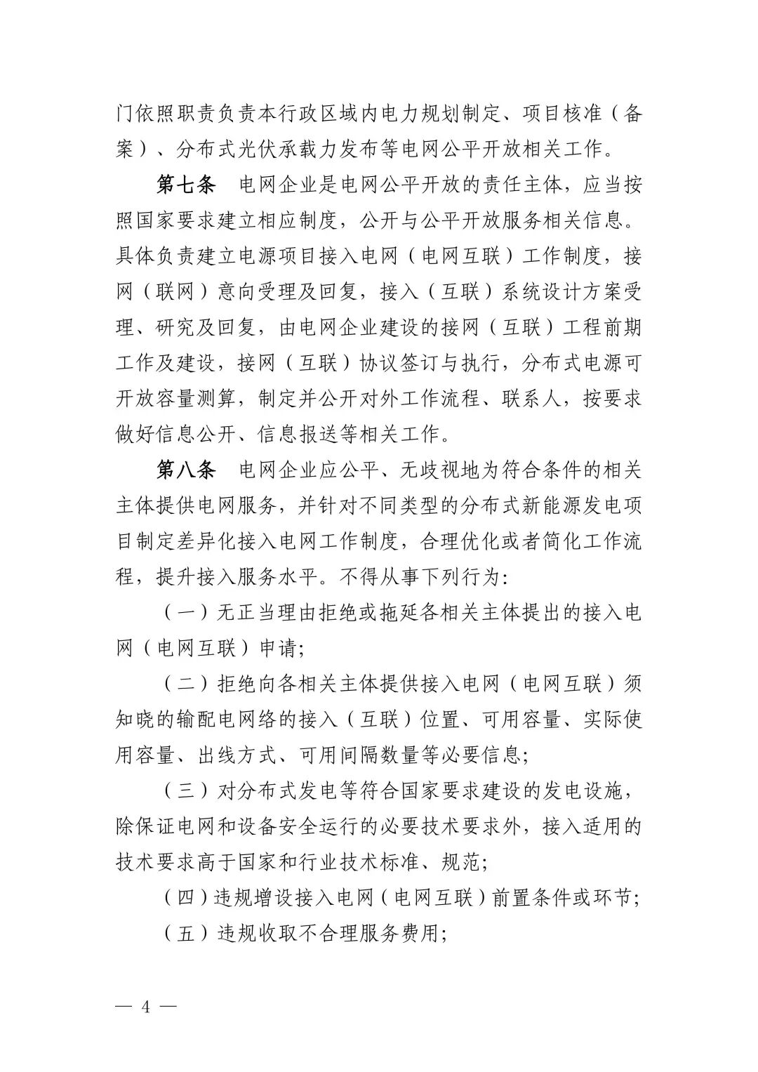 3.强化信息公开与报送管理。一是明确电网企业公开义务,分主动公开和依申请公开两类,主动公开接入制度、分布式光伏可开放容量等信息,依申请公开项目进展、工程概况等信息。二是设定项目主体报送要求,相关项目每月向电网企业报送项目进展。三是细化电网企业报送义务,每月报送220千伏及以上项目进展,每季度报送电网公平开放整体情况。