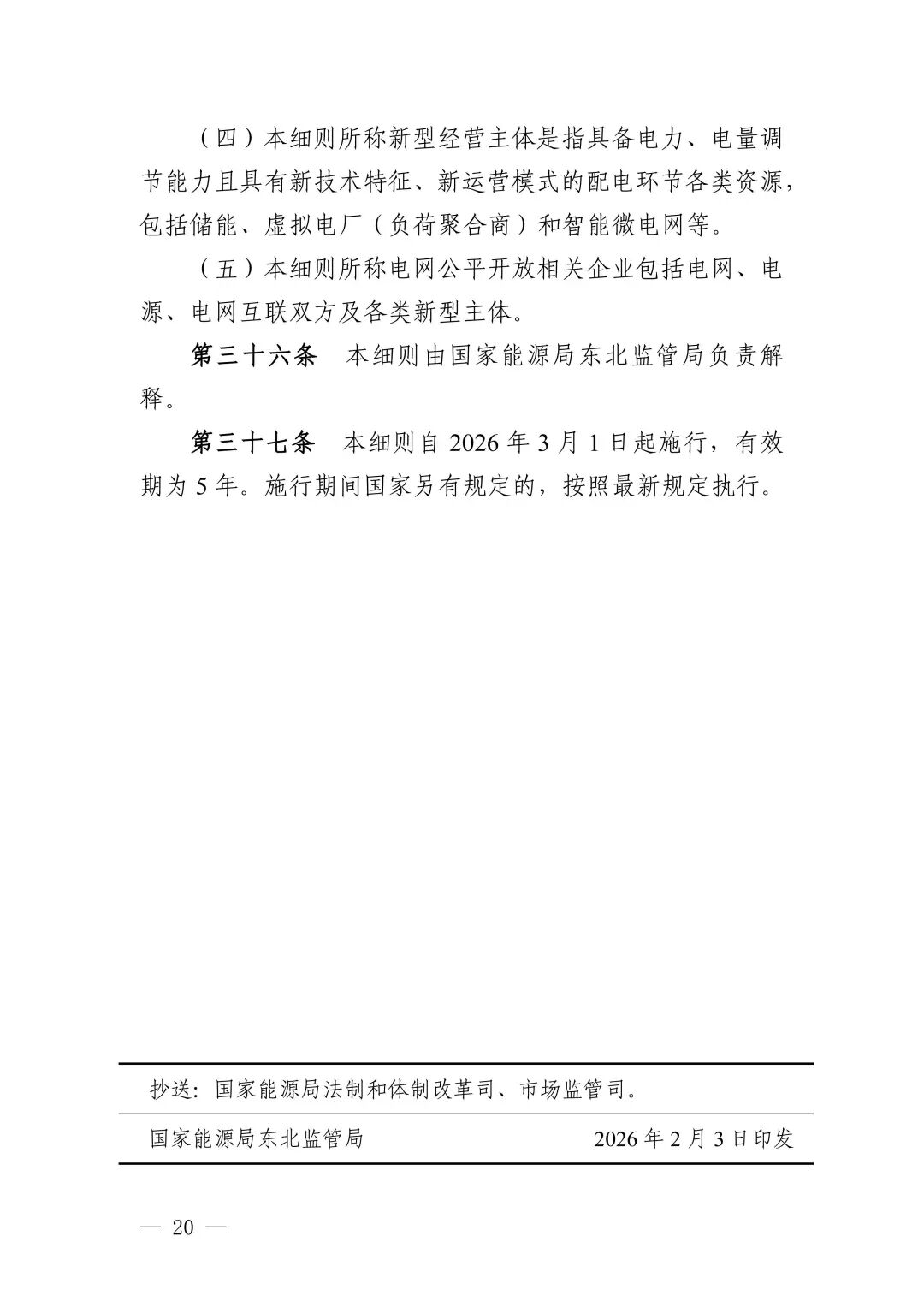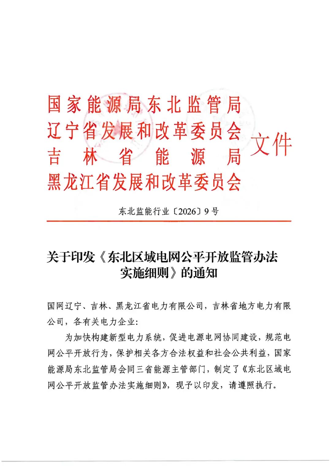 北极星储能网讯:2026年2月26日,东北能监局发布《东北区域电网公平开放监管办法实施细则》,细则适用于东北区域电源接入各类电网,以及地方独立电网、增量配电网、微电网与省级及以下大电网互联工程的流程、时限、信息公开等工作。同时,明确将储能、虚拟电厂、智能微电网等新型经营主体接网工作纳入监管范围。