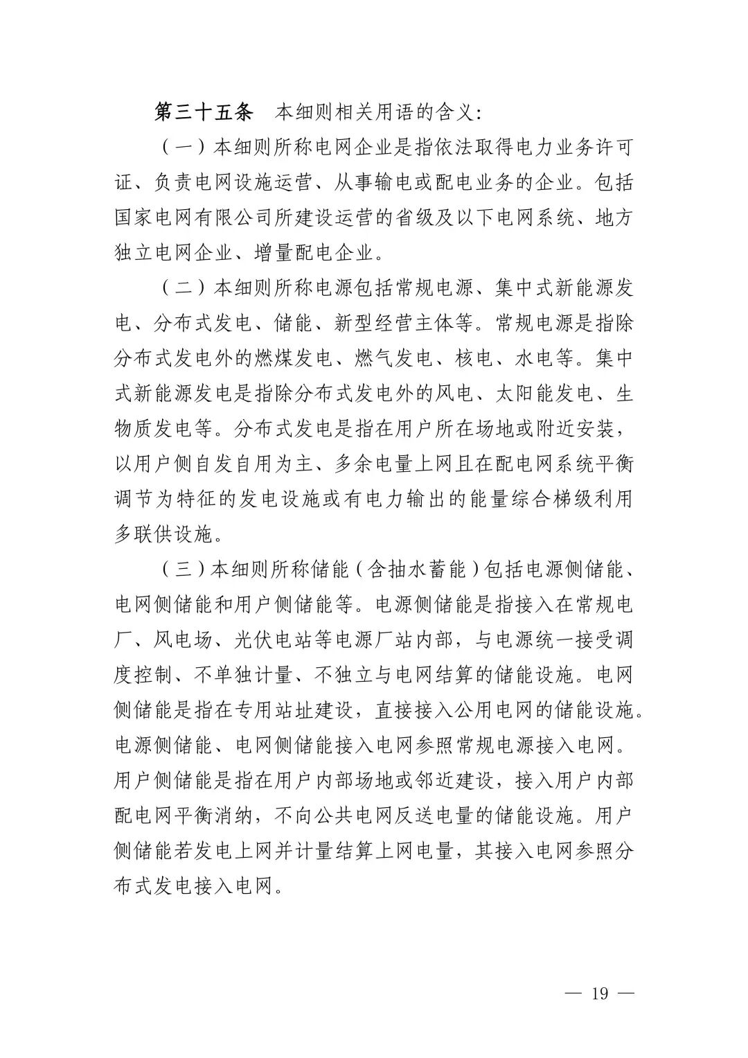 实施细则共七章三十七条,涵盖工作总体要求、各方责任、电源接入电网和电网互联的流程、时限、信息公开与信息报送、监管措施及法律责任、附则等方面。