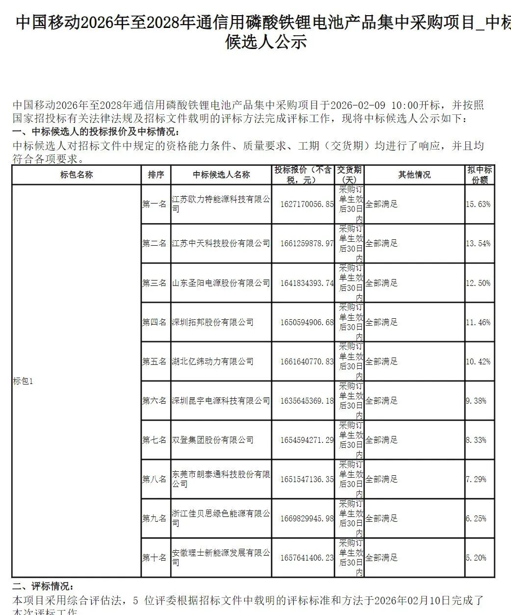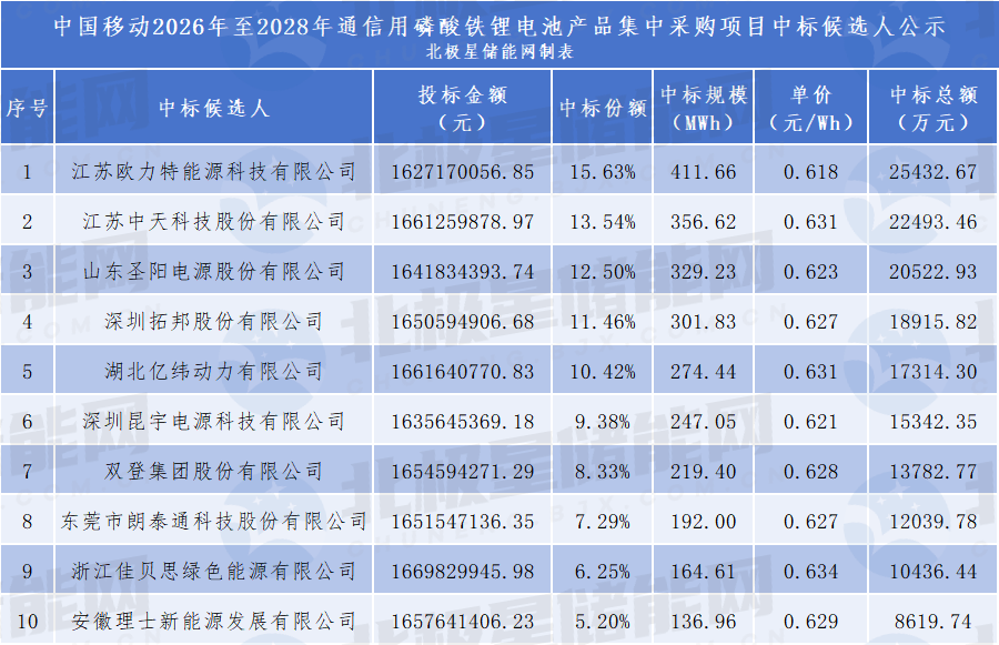 北极星储能网讯:2026年2月12日,中国移动2026年至2028年通信用磷酸铁锂电池产品集中采购项目中标候选人公示,共10家厂商中标,中标总额为16.49亿元,单价范围在0.618~0.634元/Wh。