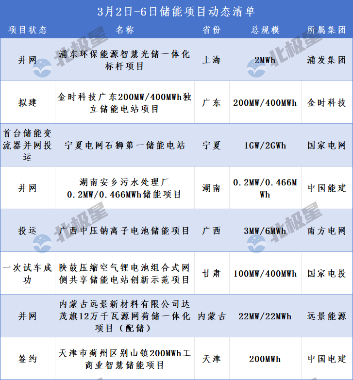 北极星储能网讯:2026年3月2日-6日,共有8个储能项目披露动态,项目状态包含拟建、签约、并网等,涉及储能规模1.3GW/3.03GWh。