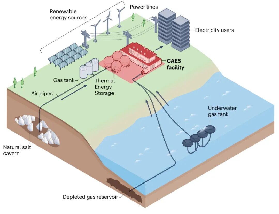 在全球加速推进能源低碳转型背景下,可再生能源规模持续增长,但其间歇性和波动性对电力系统提出很大挑战,储能技术成为解决上述问题的主要途径。压缩空气储能(CAES)(如图1)具有容量大、寿命长、成本低、环境友好等优势,被视为最具潜力的长时储能路线之一。最近二十年来,压缩空气储能技术得到了快速发展,出现了多种技术路线,工程示范项目也快速增加,但缺乏从基础研究到工程示范、从关键部件到系统集成的系统性、综合性和方向性分析。