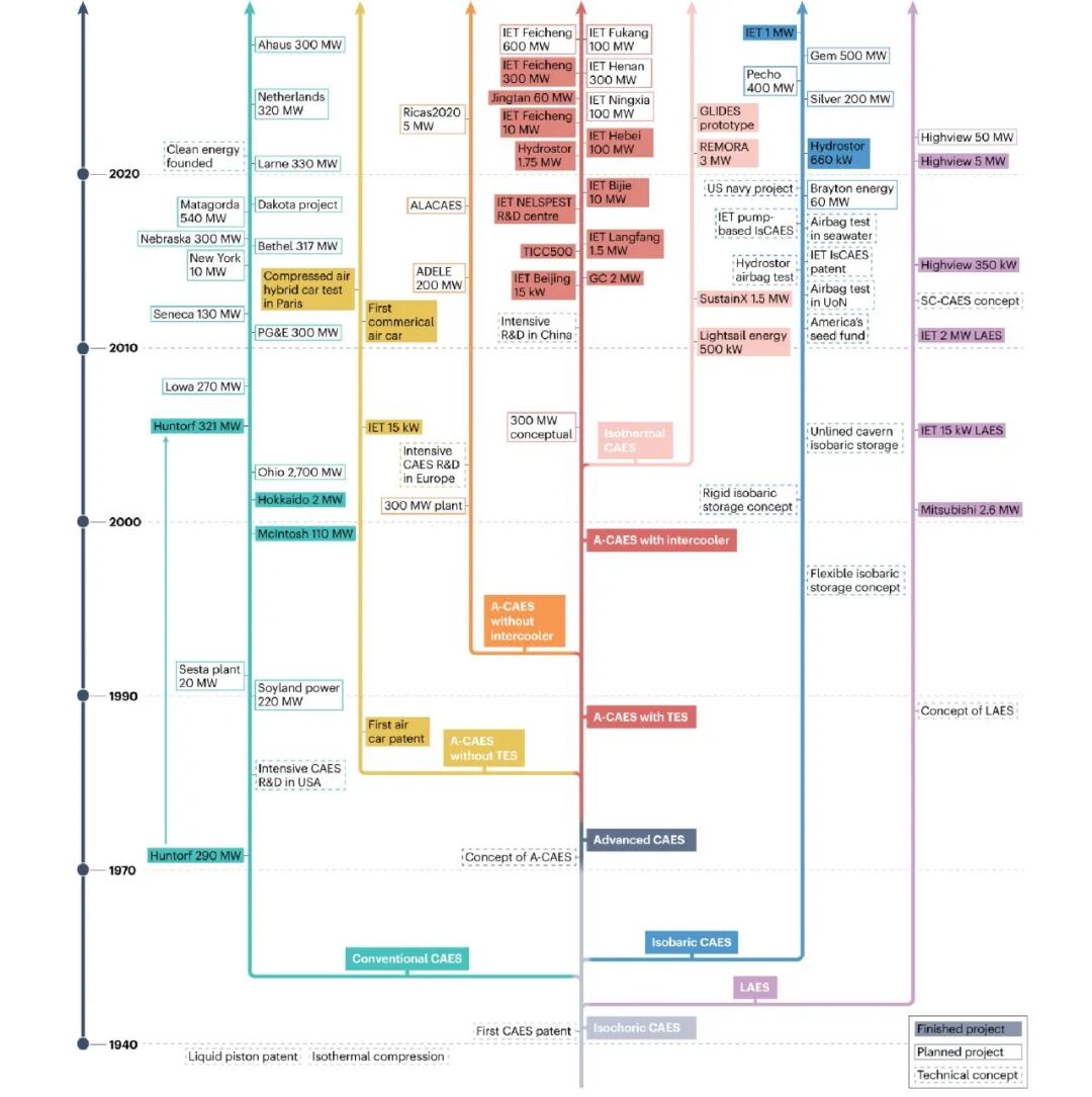 研究所储能研发中心团队获邀在《Nature Reviews Clean Technology》期刊撰写了题为《Technologies and prospects for compressed air energy storage》的综述文章,文章系统总结分析了压缩空气储能的技术原理、关键部件、系统设计、示范应用等方面的现状,并提出了未来发展路线。文章构建了清晰的系统分类及其发展图谱,明确了各类压缩空气储能技术发展路径(图2);总结和分析了1970年代以来全球压缩空气储能示范工程的发展趋势;分析了压缩空气储能关键部件与系统的研究现状、主要难点和未来技术革新点;最终提出了涵盖基础研究、技术研发、示范工程、技术应用的未来发展路线图。文章构建的技术框架与发展路线,为新一代高效、低成本压缩空气储能技术的研发与工程应用提供了重要理论支撑与方向指引。