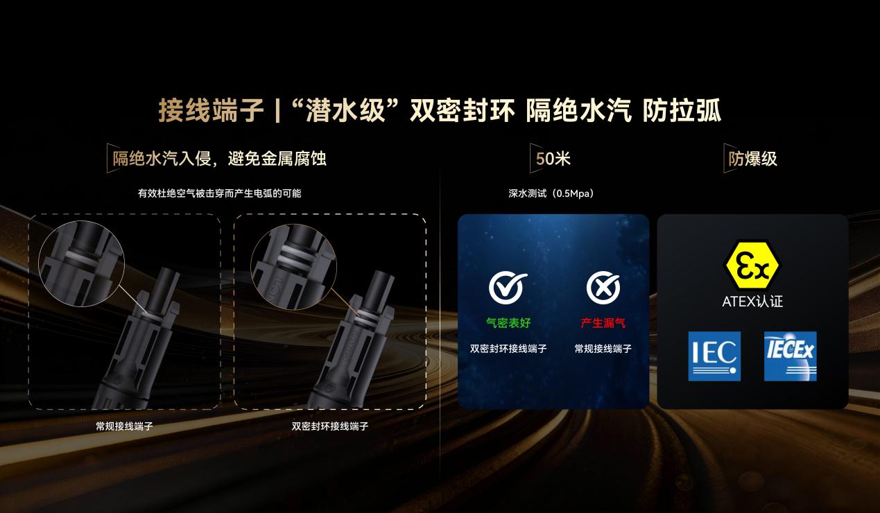 其次,采用 “潜水级”双密封环接线端子。常规单密封圈端子易因水汽入侵导致腐蚀、接触不良。Hi-MO X10的双密封圈结构,能有效隔绝水汽、腐蚀性气体,通过50米水深级气密性测试,并获得ATEX/IECEx防爆认证,从物理上杜绝空气被击穿产生电弧的可能。