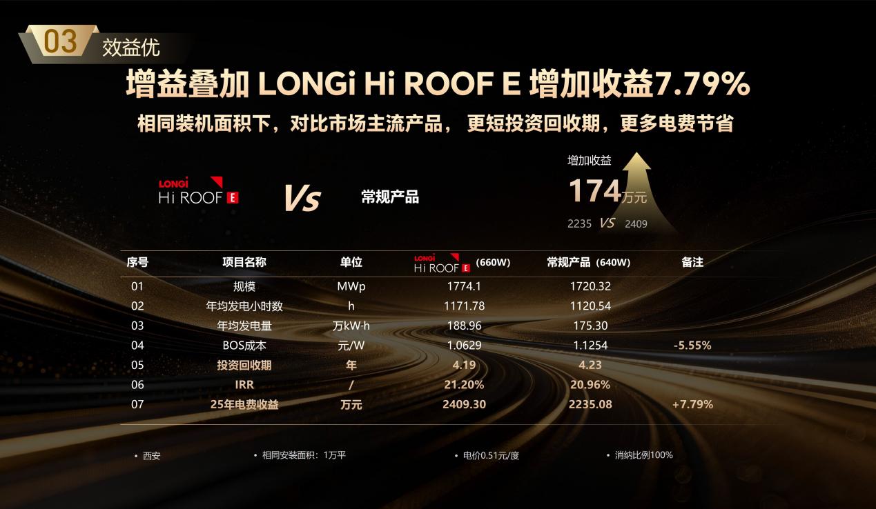 收益测算显示,以西安某1万平米工商业屋顶为例,同样的屋顶面积,对比市场最高的640W产品,采用LONGi Hi ROOF E (660W)系统,BOS(初始投资成本)成本降低了5.55%,25年可多赚174万元。