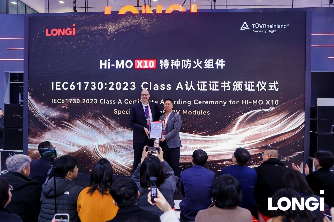 随后,德国莱茵TÜV为Hi-MO X10颁发国内首个完整组件Class A级防火认证。这份认证的特殊之处在于:它不是仅对单块送样组件负责的“检测报告”,而是对每一块量产组件负责的“认证证书”。