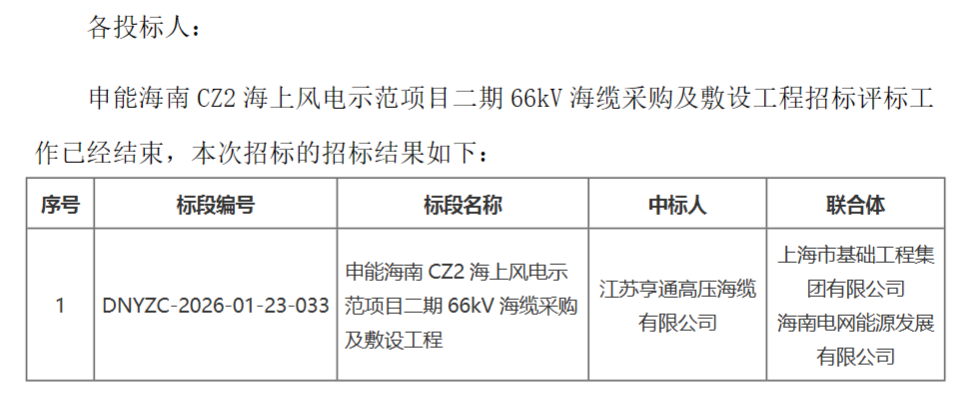 66kV海缆采购及敷设工程中标人:江苏亨通高压海缆有限公司(联合体:上海市基础工程集团有限公司、海南电网能源发展有限公司),中标价格:24812.33003万元。