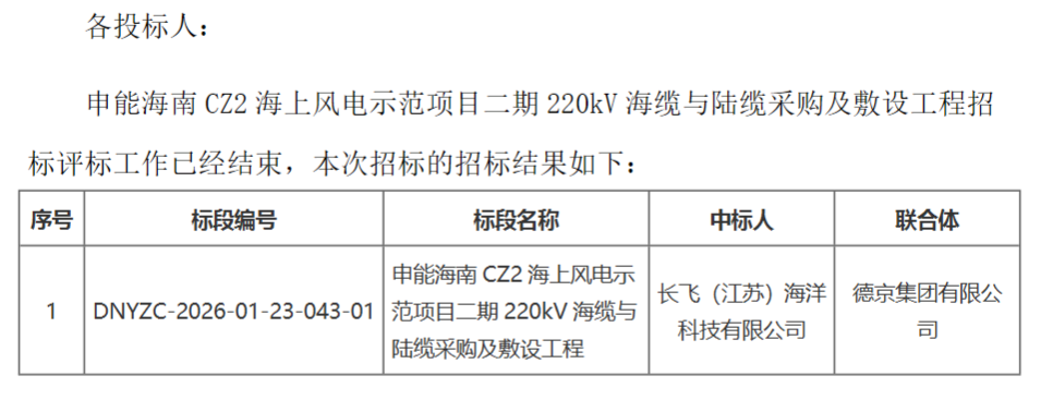 220kV海缆与陆缆采购及敷设工程中标人:长飞(江苏)海洋科技有限公司(联合体:德京集团有限公司),中标价格:50407.0985万元。