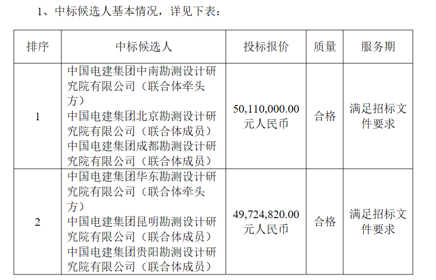 公告显示,第一中标候选人:中国电建集团中南勘测设计研究院有限公司(联合体牵头方)、中国电建集团北京勘测设计研究院有限公司(联合体成员)、中国电建集团成都勘测设计研究院有限公司(联合体成员),投标报价:50,110,000.00元。
