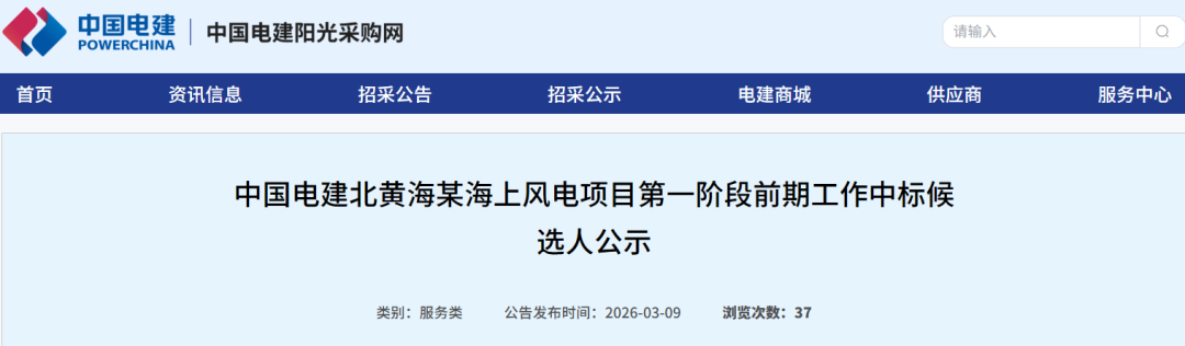 北极星风力发电网获悉,3月9日,中国电建阳光采购网发布《中国电建北黄海某海上风电项目第一阶段前期工作中标候选人公示》。
