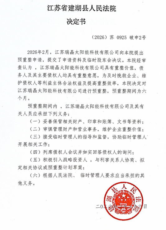 江苏省建湖县人民法院决定书显示,2026年2月,江苏瑞晶太阳能科技有限公司向建湖法院提出预重整申请,提交了申请资料及临时股东会议决议。建湖法院经审查认为,江苏瑞晶太阳能科技有限公司具有重整价值,债务人及其主要债权人均具有重整意愿,为及时挽救企业、维护债权人等利益主体合法权益及提高重整效率,建湖法院决定对江苏瑞晶太阳能科技有限公司进行预重整,预重整期间为六个月。