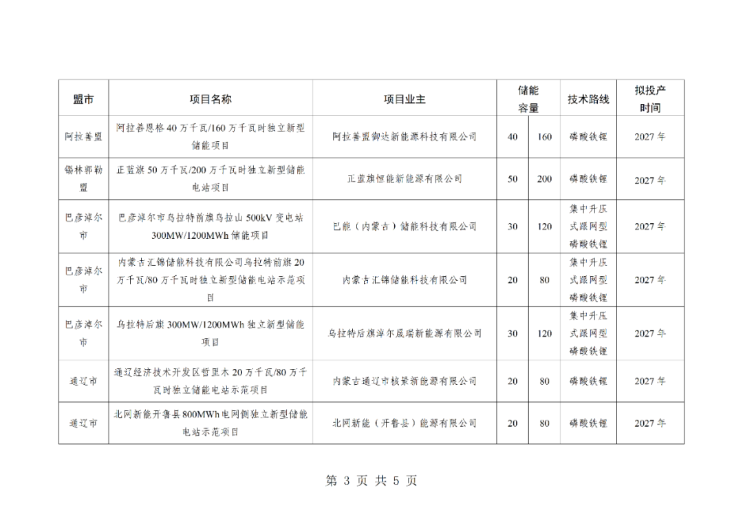 从技术路线上看,所有项目均为磷酸铁锂电池储能技术,有3个项目采用磷酸铁锂+全钒液流电池,规模均为200MW/800MWh;1个项目采用磷酸铁锂+钠离子电池技术,规模为0.5GW/2GWh。此外,巴彦淖尔三个项目强调为跟网型储能。
