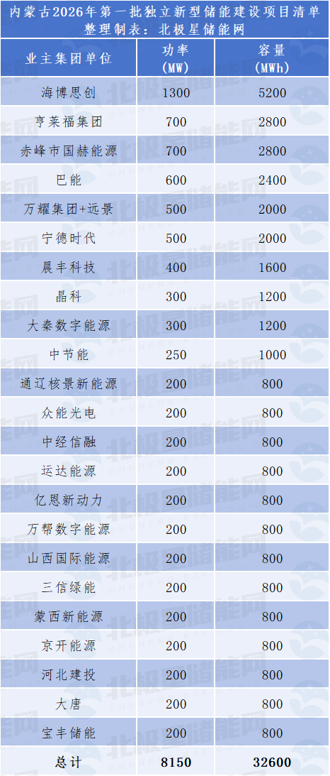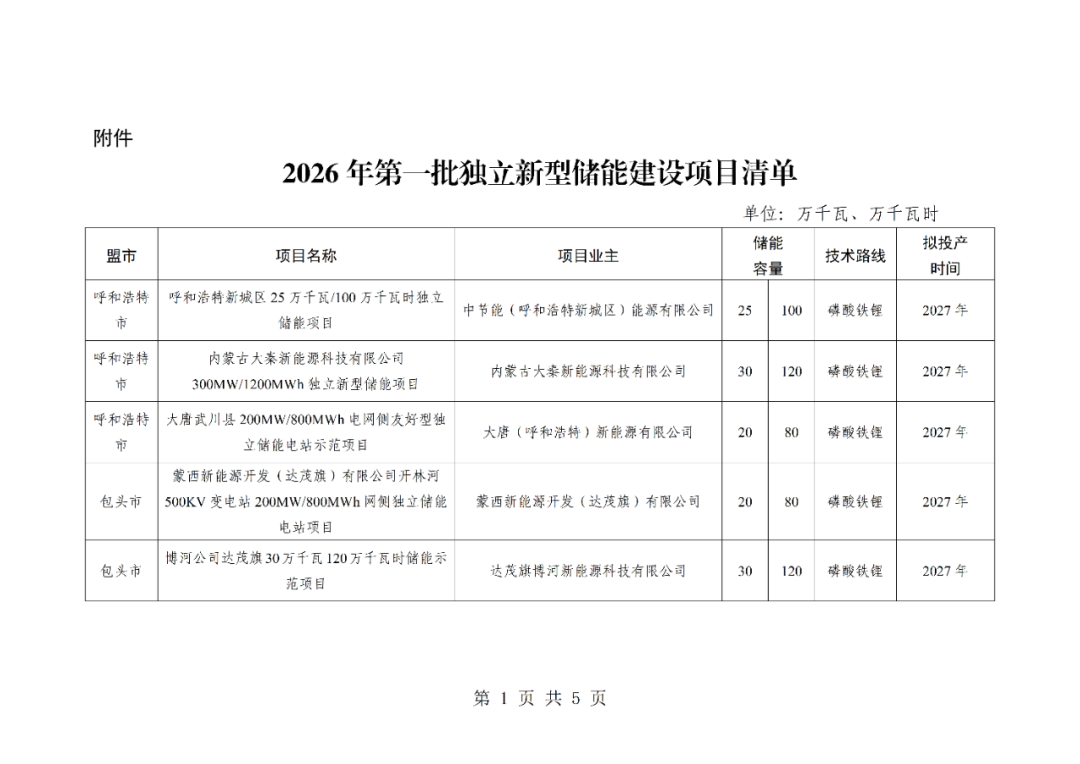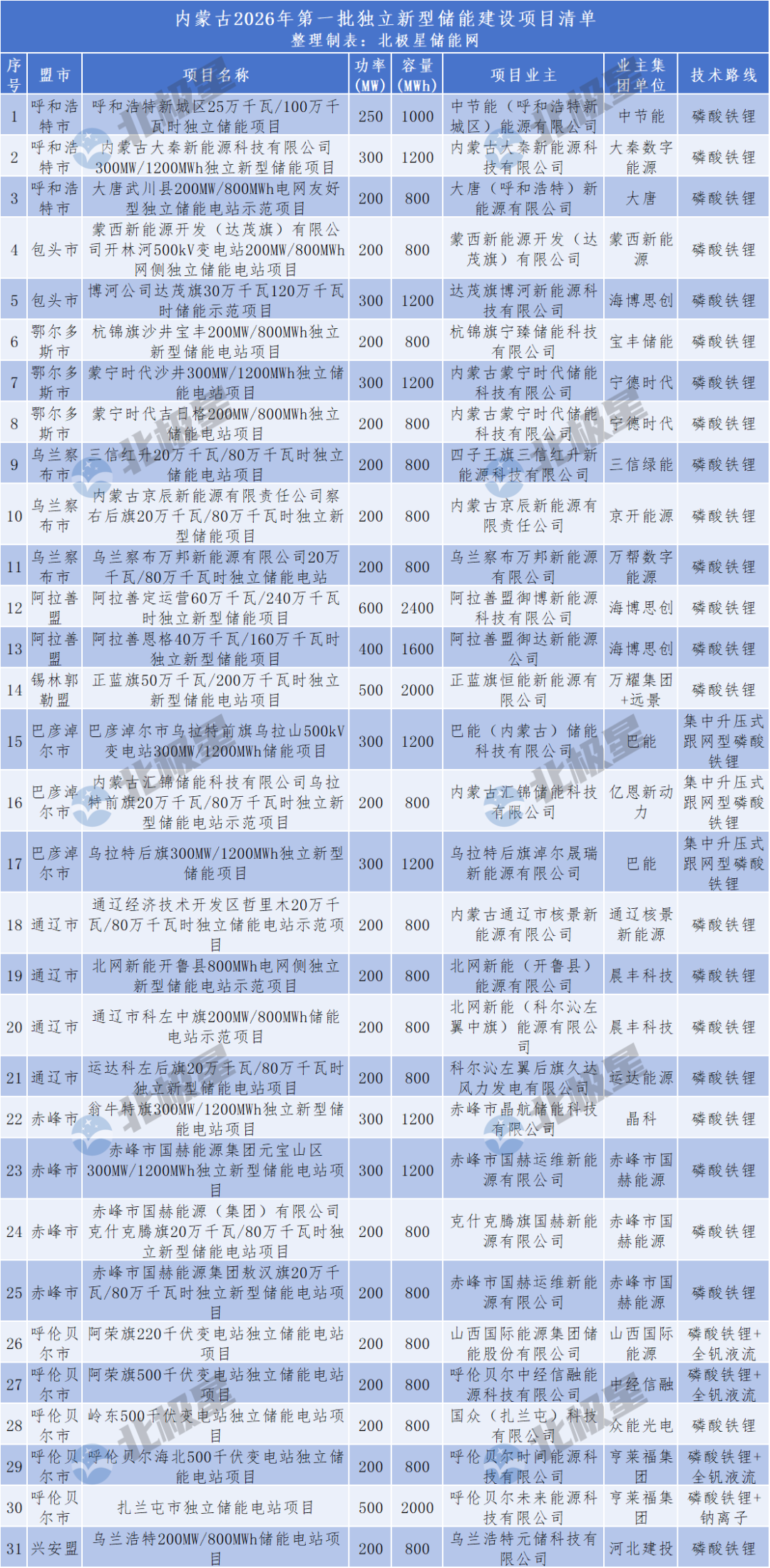 北极星储能网讯:近日,内蒙古自治区能源局印发《2026年第一批独立新型储能建设项目清单》,确定31个独立储能项目纳入规划,总装机8.15GW/32.6GWh,拟投产年度为2026年和2027年。文件要求项目建成两年内不得擅自转让股份或更改投资主体。