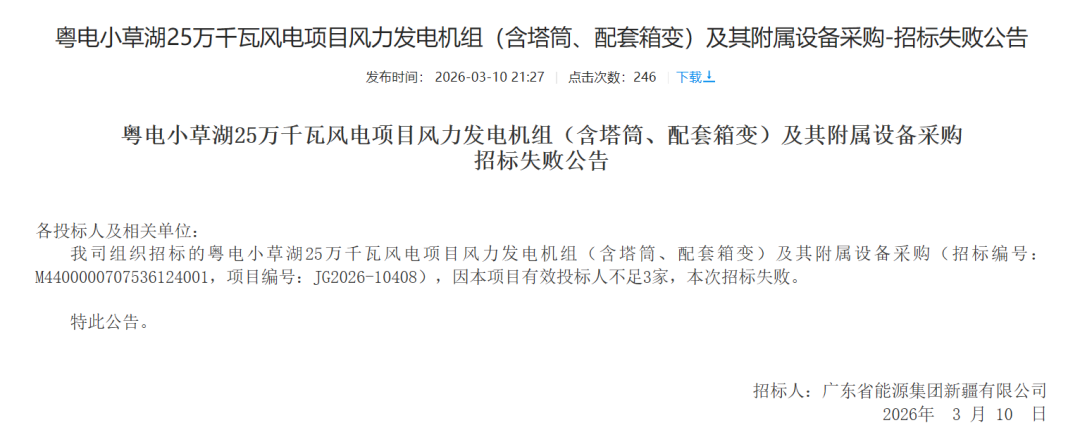 北极星风力发电网获悉,3月10日,粤电小草湖25万千瓦风电项目风力发电机组(含塔筒、配套箱变)及其附属设备采购招标失败公告发布。