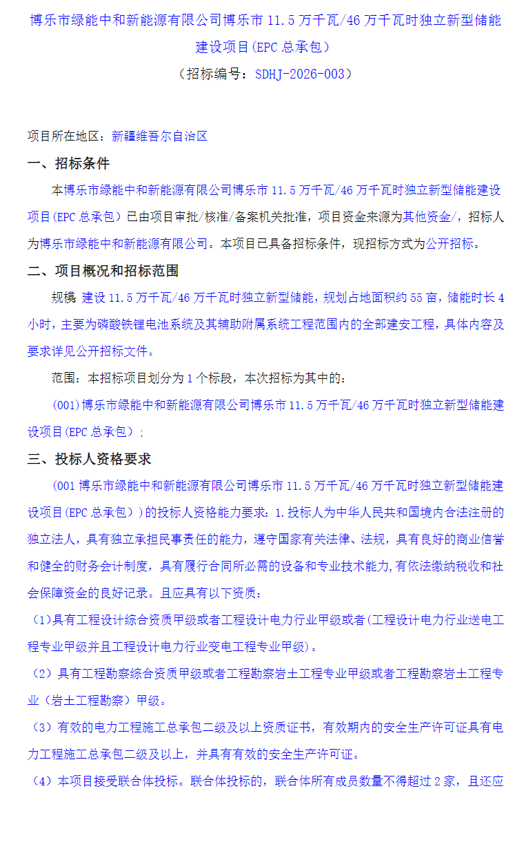 北极星储能网讯:2026年3月16日,新疆博乐市绿能中和新能源有限公司博乐市11.5万千瓦/46万千瓦时独立新型储能建设项目(EPC总承包)发布招标公告,建设115MW/460MWh独立新型储能,规划占地面积约55亩,储能时长4小时,主要为磷酸铁锂电池系统及其辅助附属系统工程范围内的全部建安工程。项目允许联合体投标,满足相关条件即可。