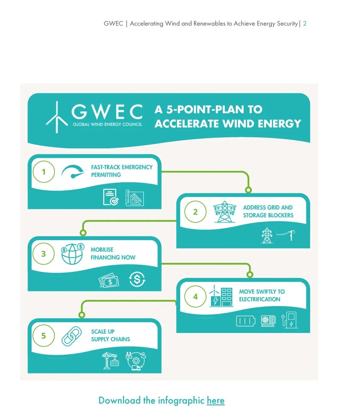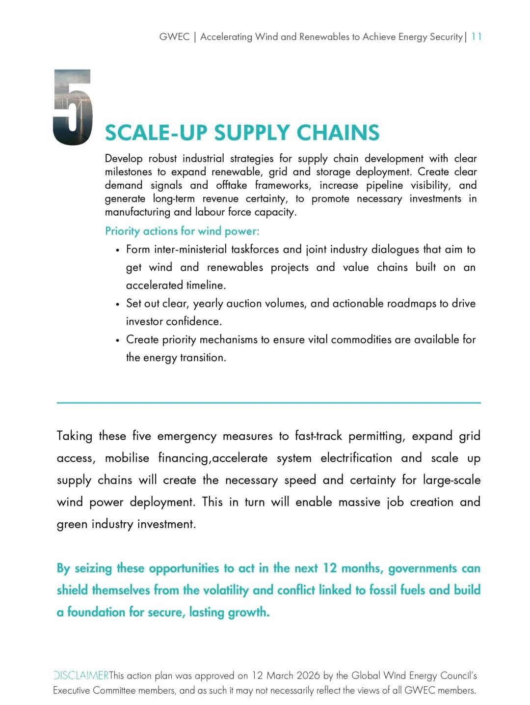 该计划提出了五项可在未来12个月内执行的紧急措施,包括:通过紧急许可流程在未来36个月内大幅扩大风能产能、扩展和优化电网以加速风电接入、通过金融工具为项目调动资金、加速交通和工业领域的终端电气化,以及制定战略以扩大可再生能源供应链规模。