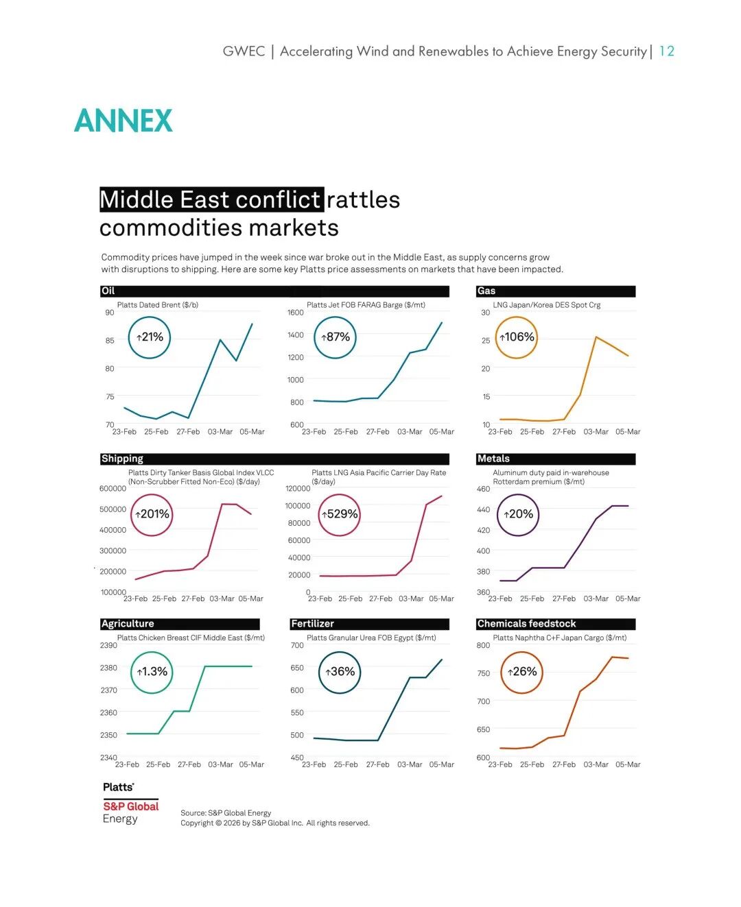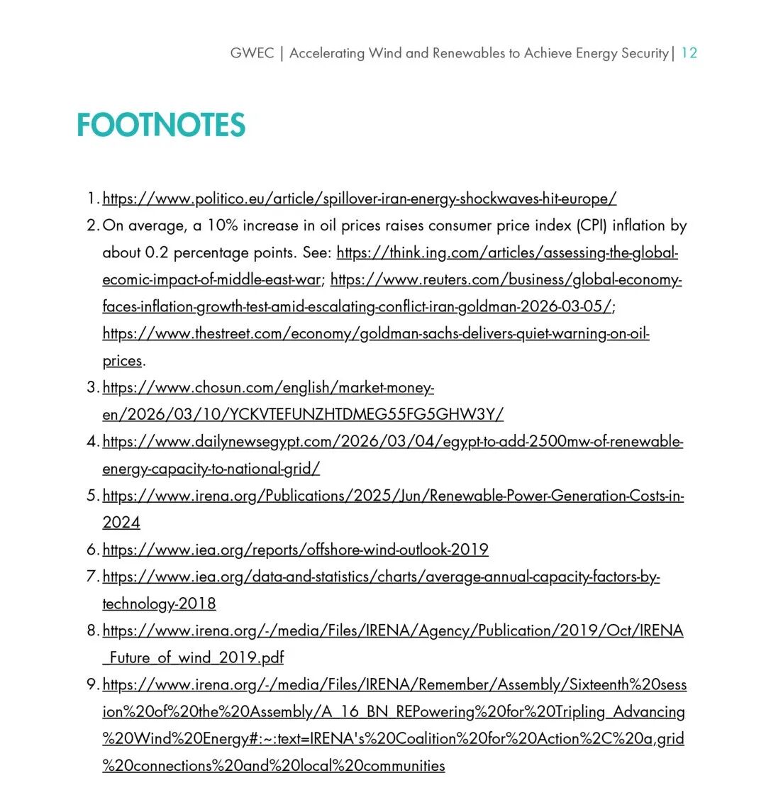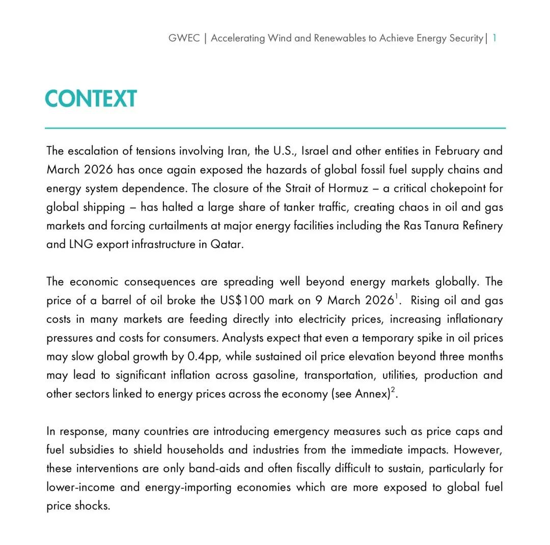 该行动的背景是,2026年2月至3月,中东地区紧张局势升级导致霍尔木兹海峡被关闭,这一全球航运咽喉要道的阻塞引发了油气市场的剧烈波动。原油价格已于3月9日突破每桶100美元大关,对全球能源市场和经济造成了通胀压力与增长放缓的巨大风险。GWEC警告,除非各国加速发展国内可再生能源,否则家庭和企业将面临新一轮能源成本压力。