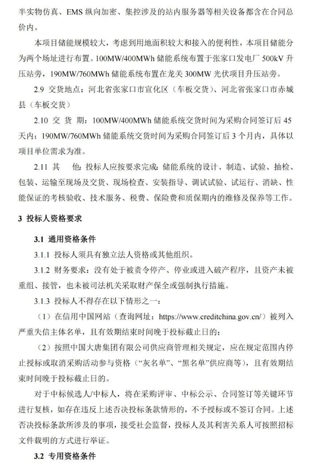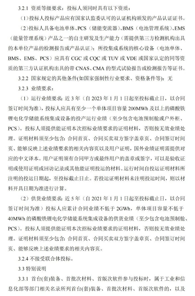 项目要求投标人近3年具有至少一个单体项目容量200MWh及以上的磷酸铁锂电化学储能系统集成设备的投产运行业绩。且近5年应累计合同业绩不低于2GWh,单体项目容量不低于40MWh的磷酸铁锂电化学储能系统集成设备的供货业绩。且不接受联合体投标。