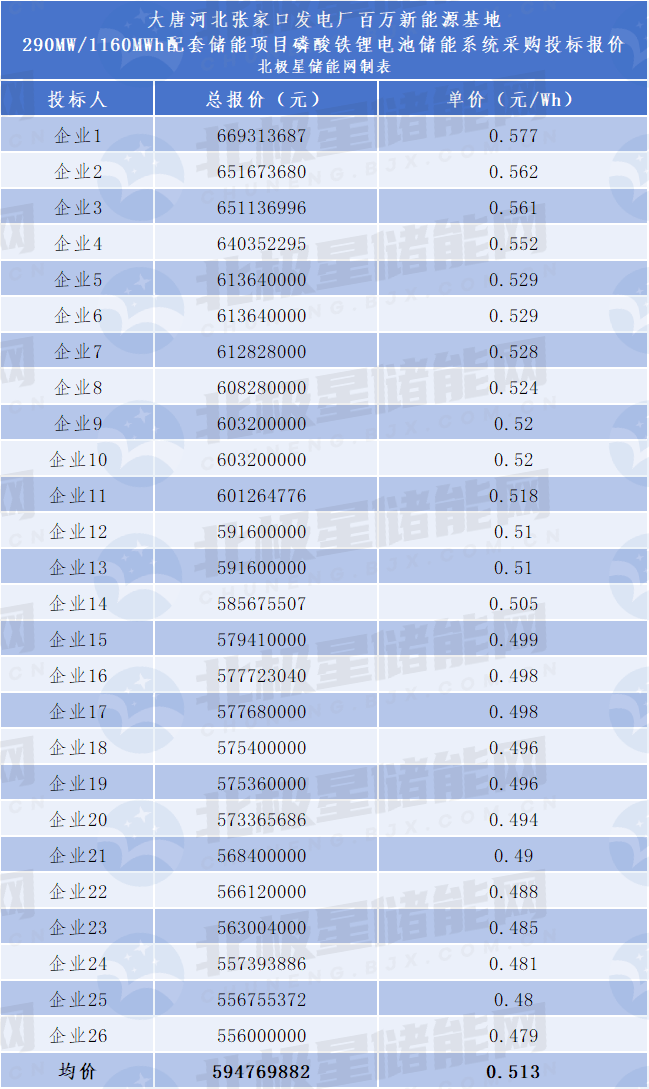 项目共计26家企业参与投标,投标报价单价范围为0.479~0.577元/Wh,平均投标报价为594769881元,平均单价为0.513元/Wh。其中12家企业报价在0.4~0.5元/Wh之间,14家报价在0.5~0.6元/Wh之间。
