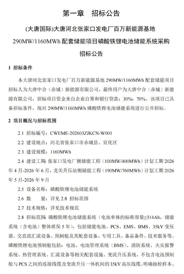 北极星储能网讯:近日,(大唐国际)大唐河北张家口发电厂百万新能源基地290MW/1160MWh配套储能项目磷酸铁锂电池储能系统采购开标。