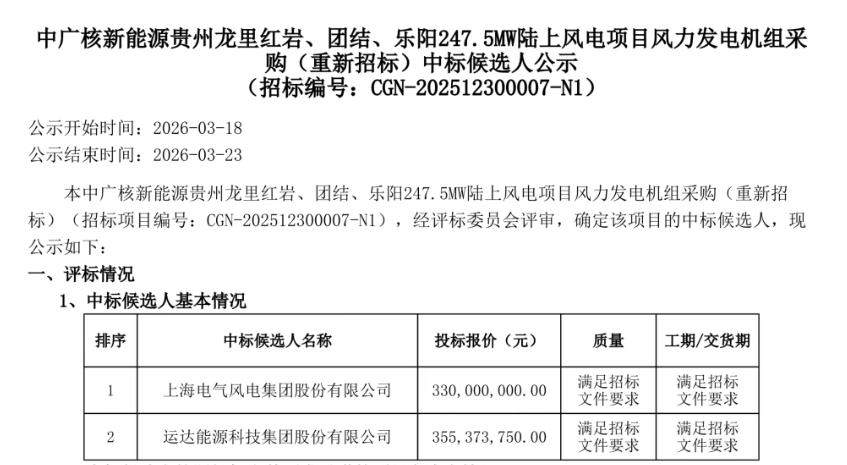 北极星风力发电网获悉,3月18日,中广核新能源贵州龙里红岩、团结、乐阳247.5MW陆上风电项目;中广核新能源广西钦北石古岭200MW陆上风电项目风力发电机组采购中标候选人公示。