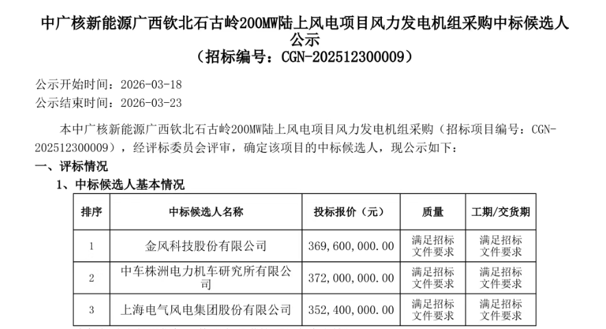 根据公示,电气风电预中标贵州龙里红岩、团结、乐阳247.5MW陆上风电项目;金风科技预中标广西钦北石古岭200MW陆上风电项目。