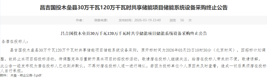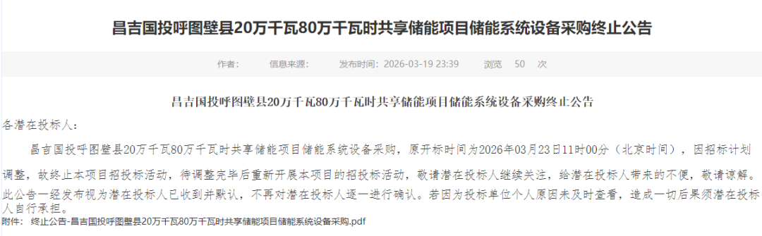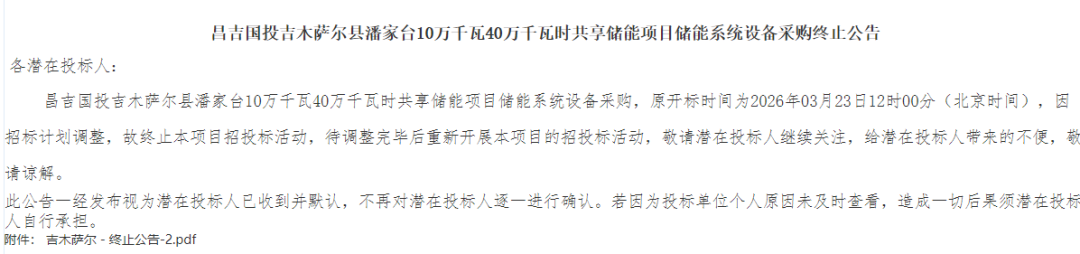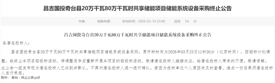 北极星储能网讯:2026年3月19日,昌吉国投发布4个共享储能项目储能系统设备采购终止公告,规模共计800MW/3.2GWh,终止原因皆为招标计划有调整,招标时均不允许联合体投标。
